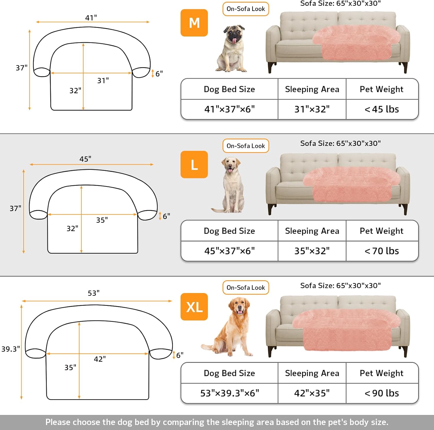 • 【Multiple Size Selection】The couch pet bed has 5 sizes for you to choose from. XS: 31"x23.5" dog bed for small pets. S: 35“x31" dog bed for cats and small dogs. M: 41”x37" dog bed for medium dogs. L: 45“x37" dog bed for large dogs. XL:53"x39" dog bed for large dogs. We have enlarged the sleeping area for pets to give dogs more space.