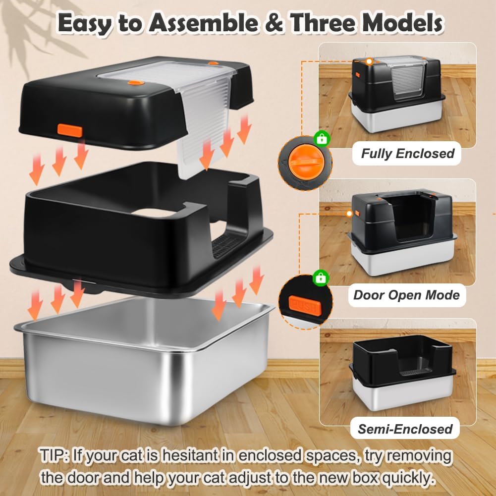 • THREE VERSATILE MODES - Our extra large litter box offers three modes: fully enclosed for maximum odor control to keep your home fresh; open door for added privacy and visibility, helping cats adjust to the new box; and semi-enclosed for optimal airflow and easy cleaning, especially for cats wearing collars