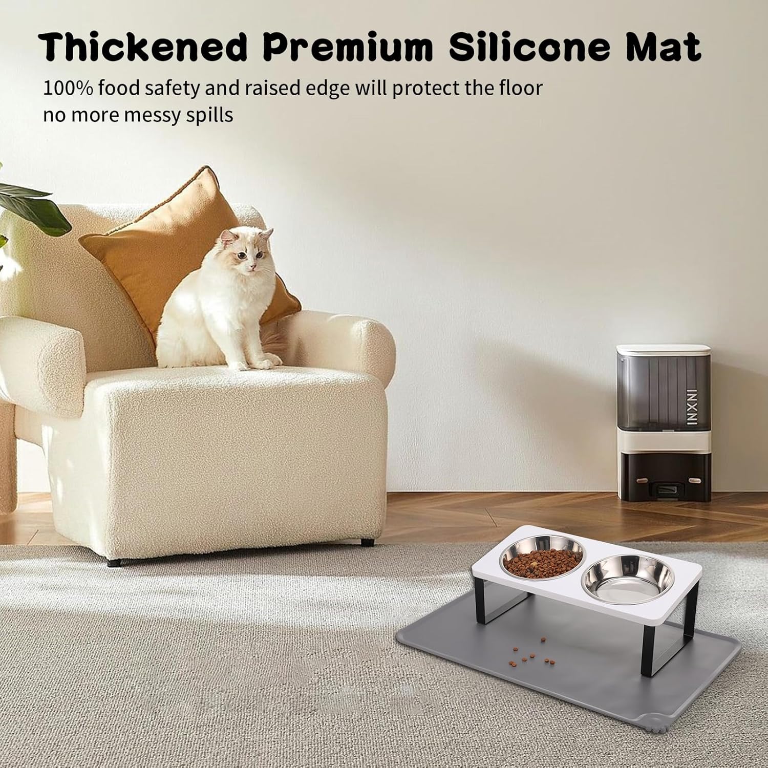 • 【Silicone Food Mat】Pet feeding bowl with silicone bowl mat can prevent cats and puppies from spilling food residue on the floor while feeding, keep the room or carpet clean and hygienic. Great Value Matching, Mat Size:18.9*11.8 inches.