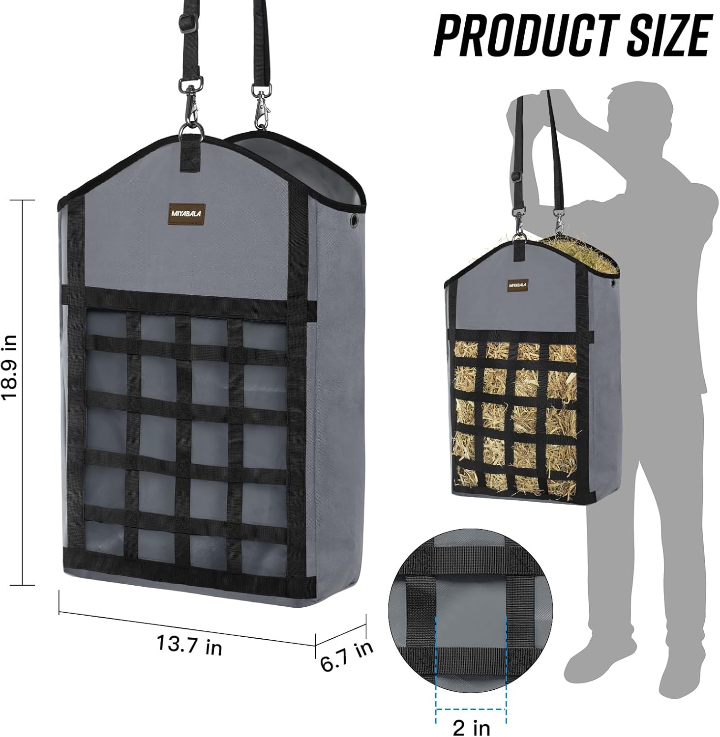 • Innovative Slow Feed Net: Featuring an innovative slow feed hay feeder for horses on the front panel, these horse hay bags promote healthy eating habits for horses. This design helps to regulate hay consumption, encouraging natural grazing behavior while preventing overeating, thereby supporting digestive health and overall well-being.