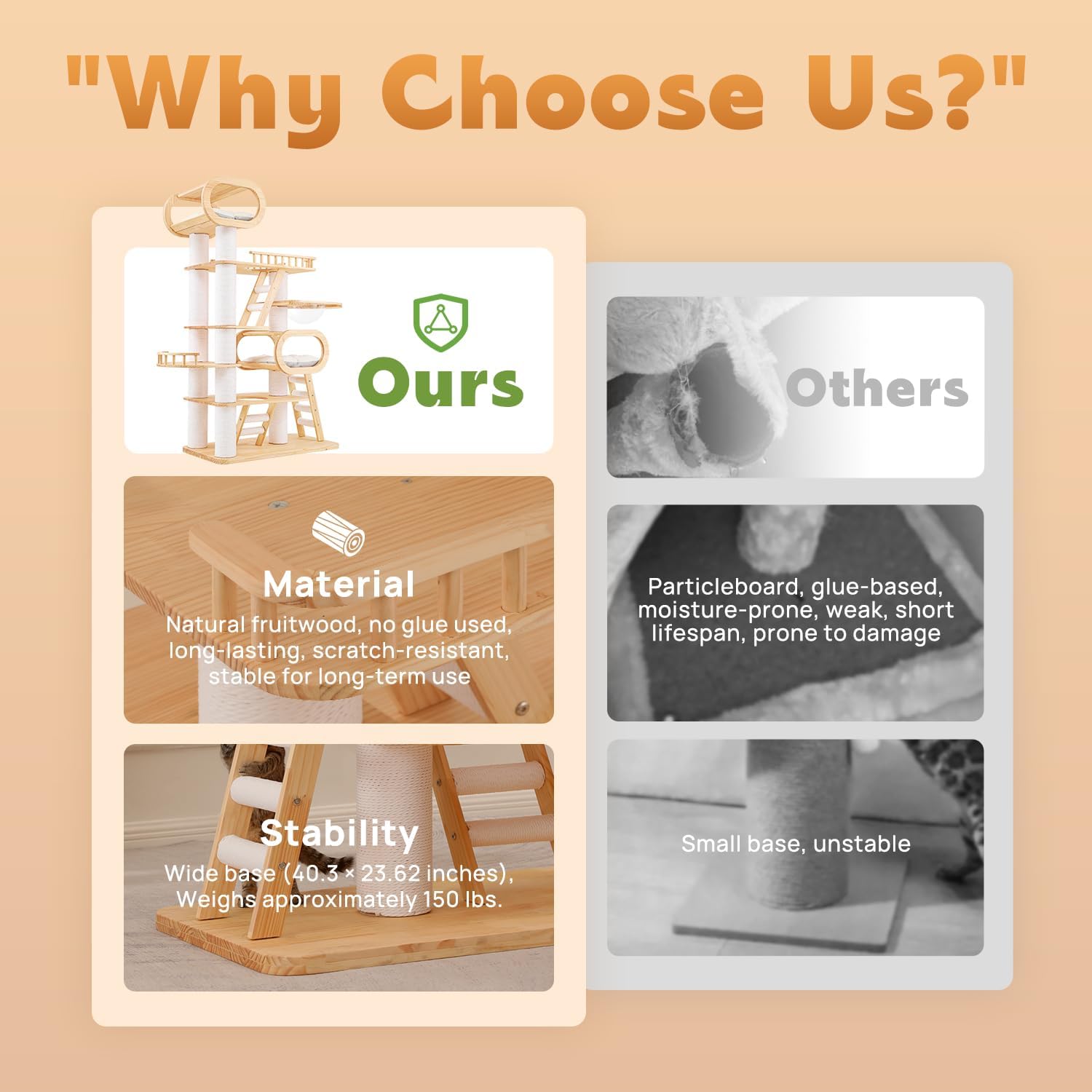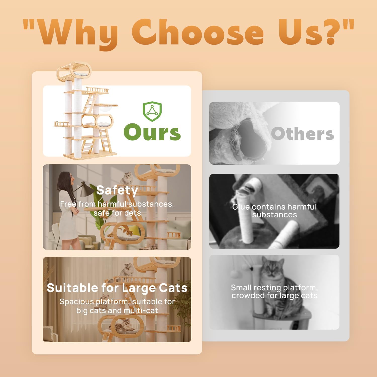 • Natural Pine Wood: KZLAA Tall Cat Tower weighs approximately 149 pounds and is made of natural pine wood and natural sisal, safe materials with no odor and will not cause harm to people and pets.