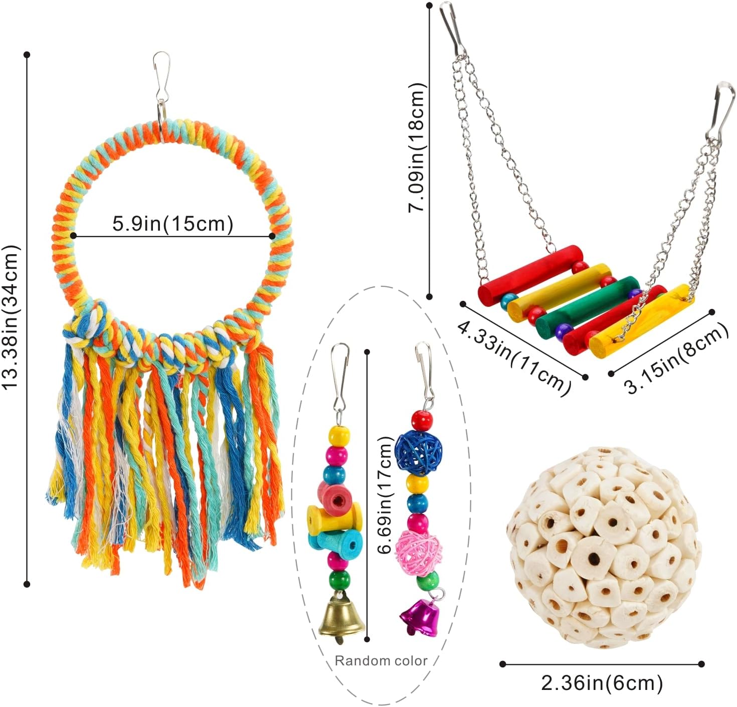 • 【DESIGN】The toys for birds set includes 5 brightly colorful handmade chewing toys, that are 1 chewing toys, 1 hanging bells toys, 2bird swing toys, 1 rattan balls.These fun bird cage toys will attract the interest of your pet birds.The loop bird swinging rope of the long tailed parrot has been optimized to the product on the first page, but the detailed pictures have not been updated in a timely manner.