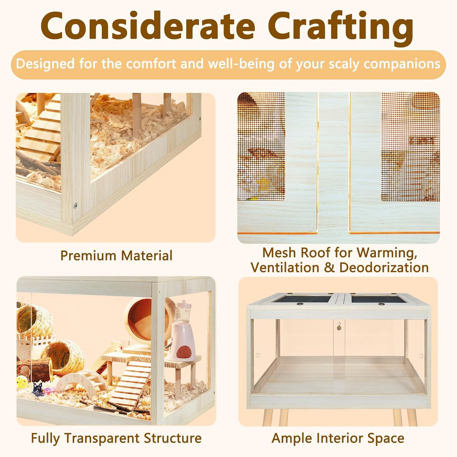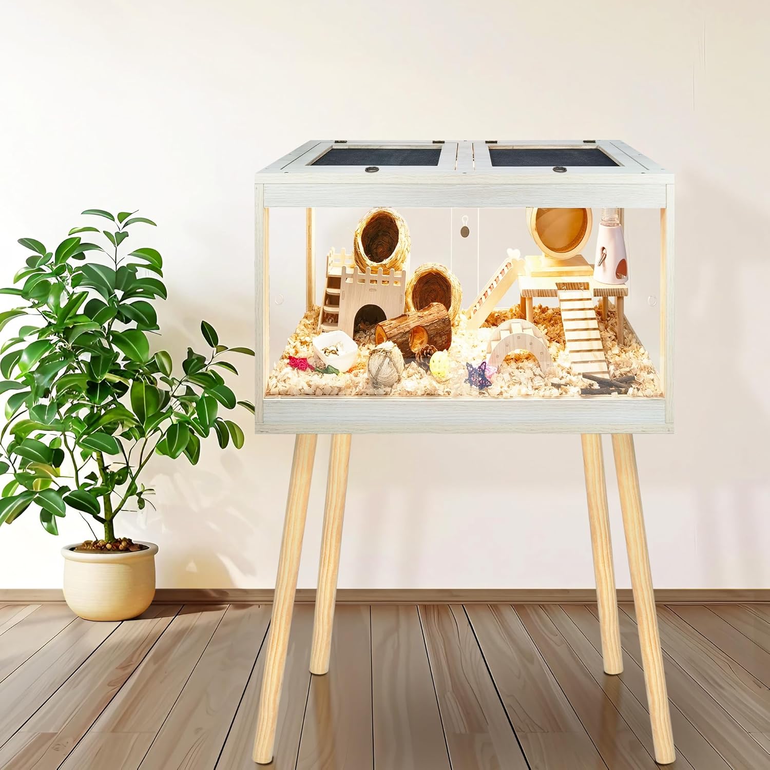 • 【Premium Quality Materials】Available in 4 sizes ranging from 24 to 48 inches in length, with 24 or 27.5 inches legs' height, please refer to picture 2 for size information. Crafted from durable, high-density natural wood treated with a rot-resistant, waterproof coating, our cage ensures longevity and aesthetic appeal. Transparent acrylic panels provide a clear view of your cherished hamsters' activities. An additional acrylic sheet on the cage bottom prevents moisture buildup, simplifying cleaning tasks.