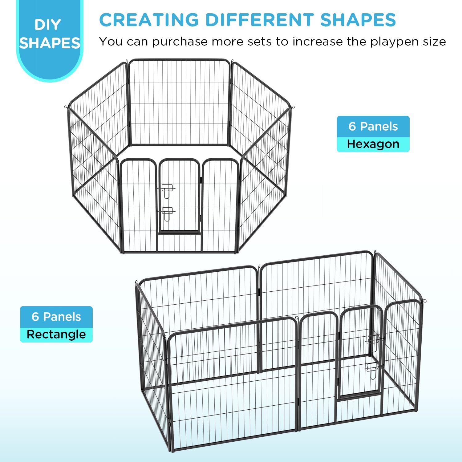 • EASY SETUP & CUSTOM CONFIGURATION: No tools are required. Shape this play pen into a square, rectangle, or octagon. Expand with panels to build a dog fence, large playpen, or dog run area.