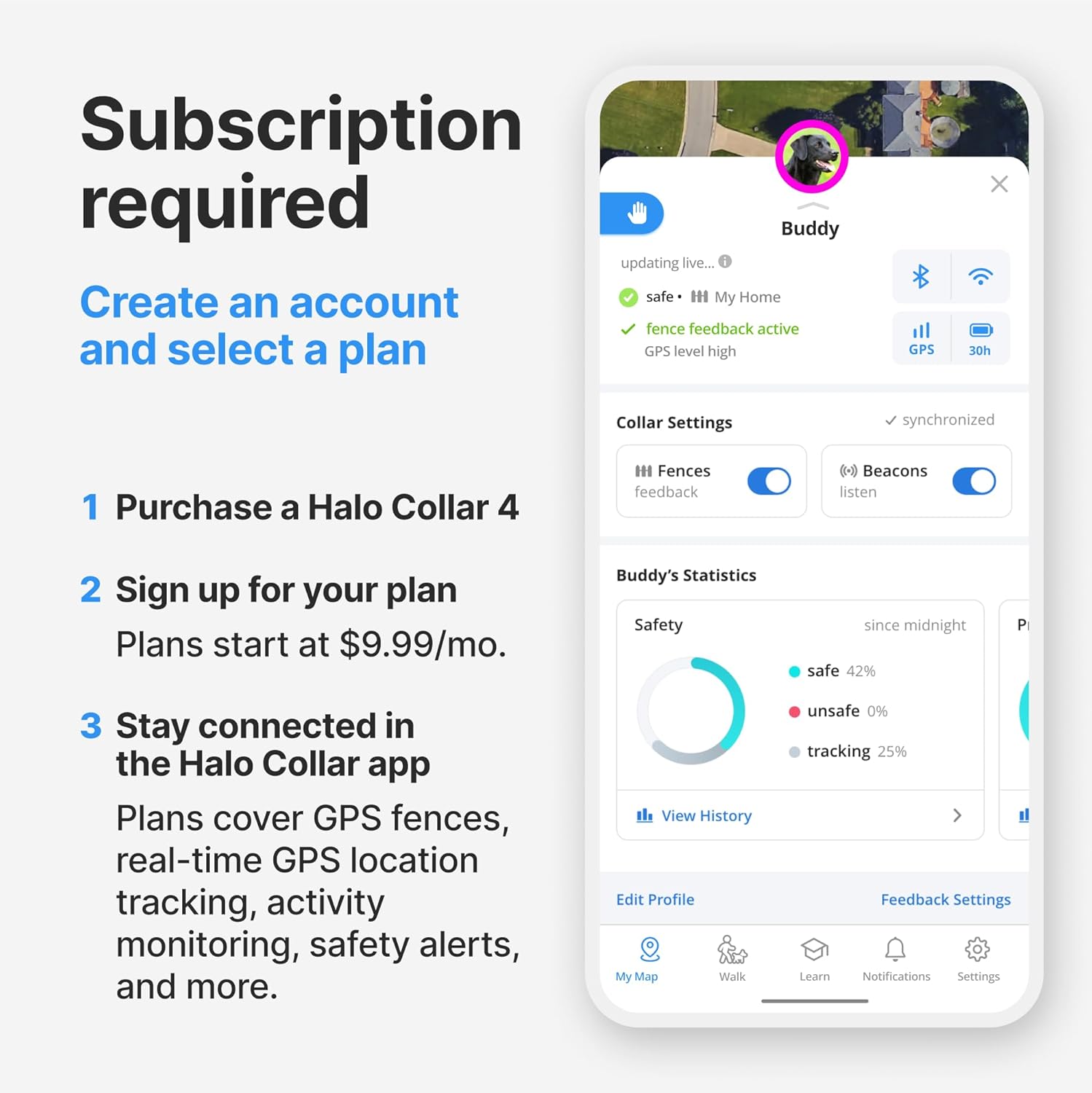 • SUBSCRIPTION REQUIRED: Your collar needs GPS services and cellular data to create, edit, and use the wireless dog fences and GPS tracking. Pack Membership Plans start at $9.99 per month. Select a plan after purchase