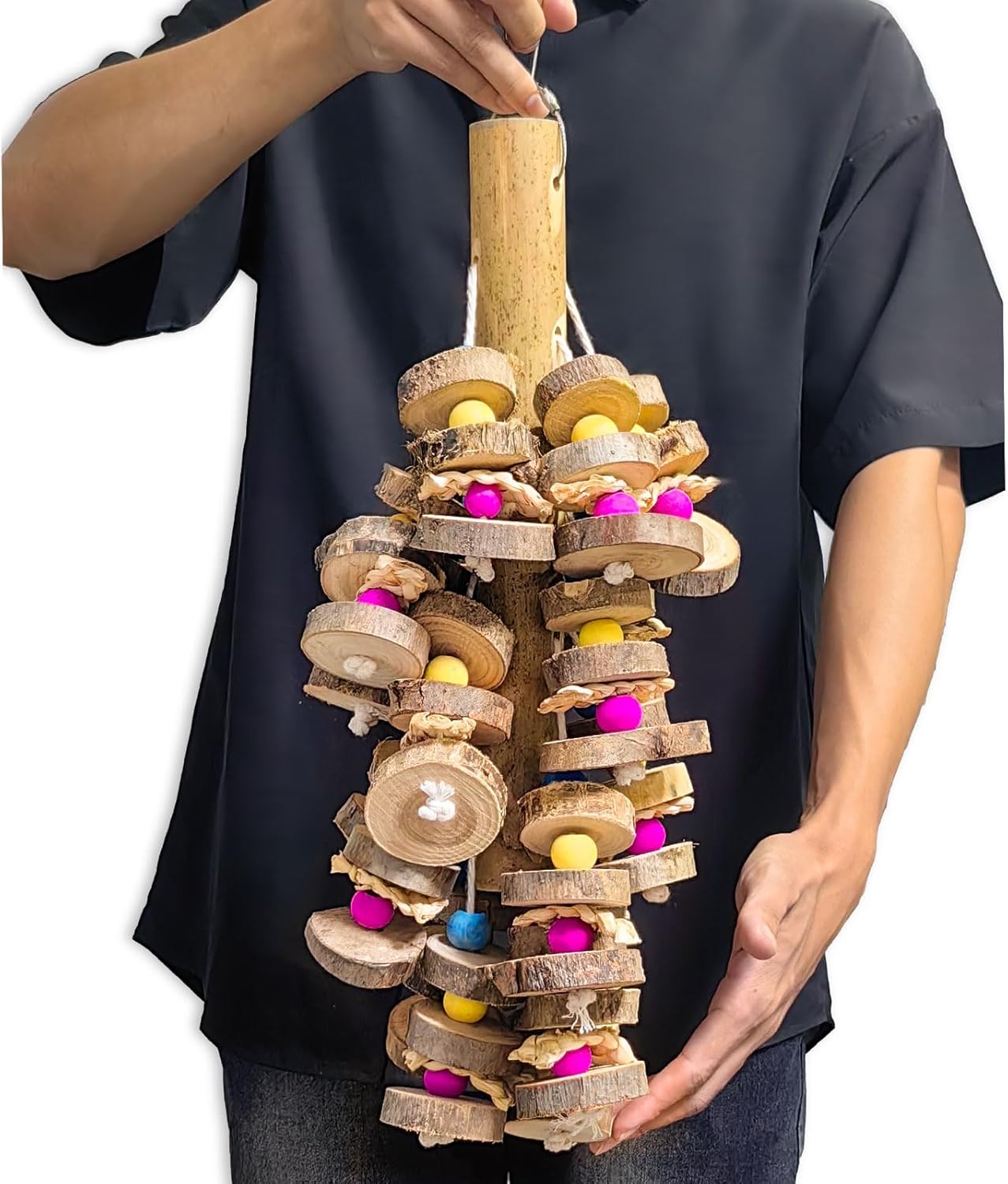 • PERFECT SIZE FOR LARGE& MEDIUM PARROT - Our parrot toys for large birds measures 19.7" with colorful wood block, Suitable for finch, budgie, love birds, parakeets, macaw, conures and African grey, cockatoos.