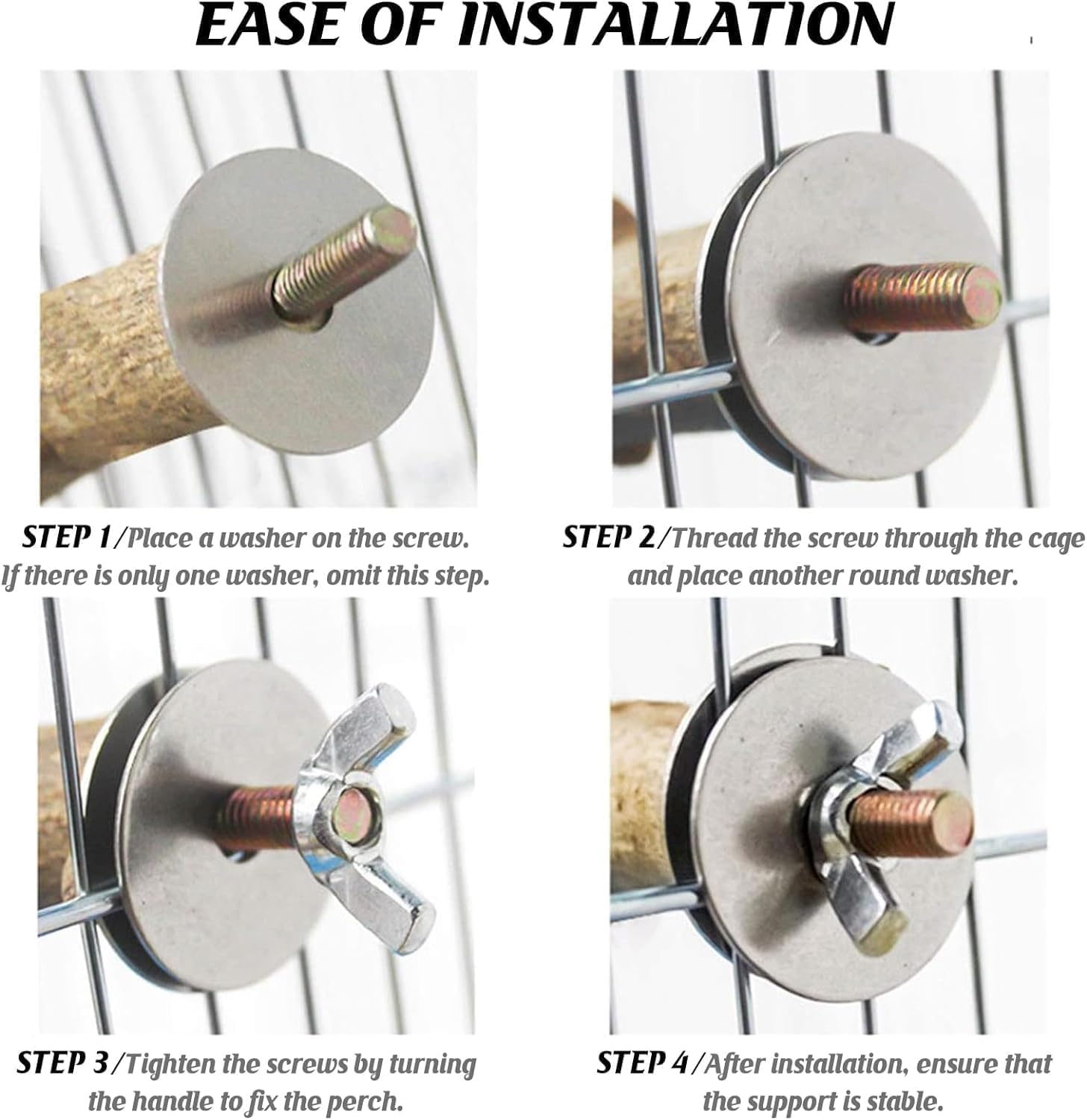 • [Simple Installation]: Each cockatiel perch is equipped with a metal wing nut and built-in bolts, just clip the bracket or platform to the bird cage with two pieces of metal washers and tighten them with screws to fix the bracket and platform stably to the bird cage, no other tools are needed