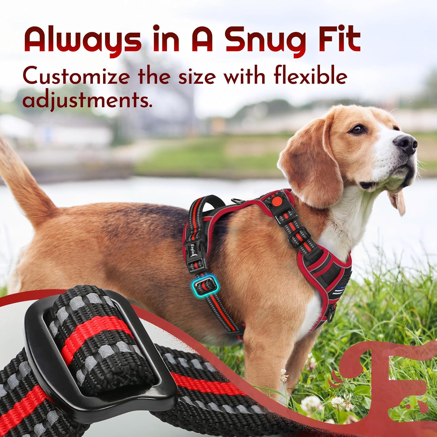• Easy to Apply: With 3 buckles, the harness allows to be opened more fully, making it easier and quiker to put on and take off. More important, it avoids going over dog's head while wearing, preventing dogs from resistance and discomfort. Featured with a secure lock at neckline, it protects against accidental release during pet's activities