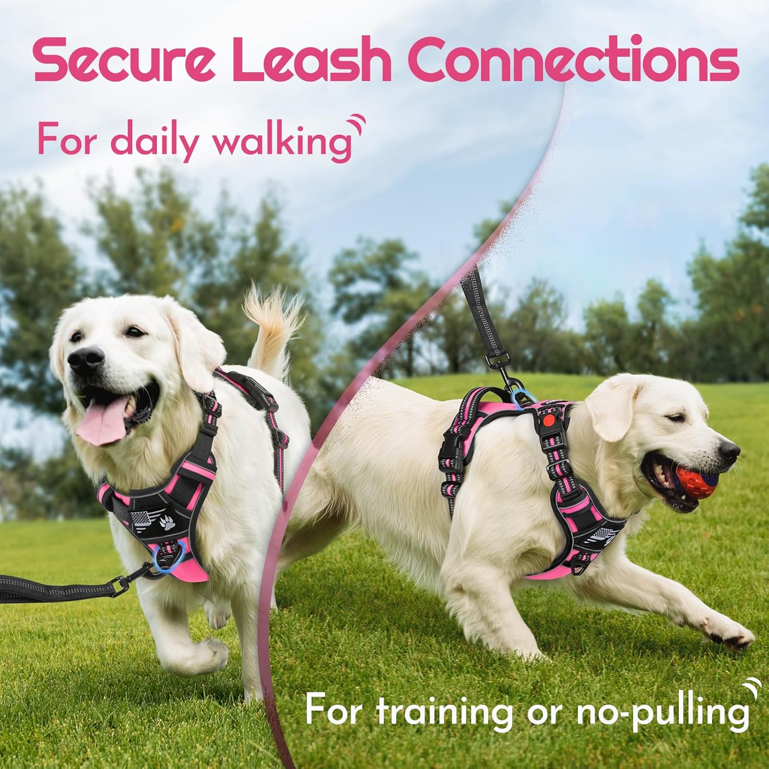 • Easy to Apply: With 3 buckles, the harness allows to be opened more fully, making it easier and quiker to put on and take off. More important, it avoids going over dog's head while wearing, preventing dogs from resistance and discomfort. Featured with a secure lock at neckline, it protects against accidental release during pet's activities