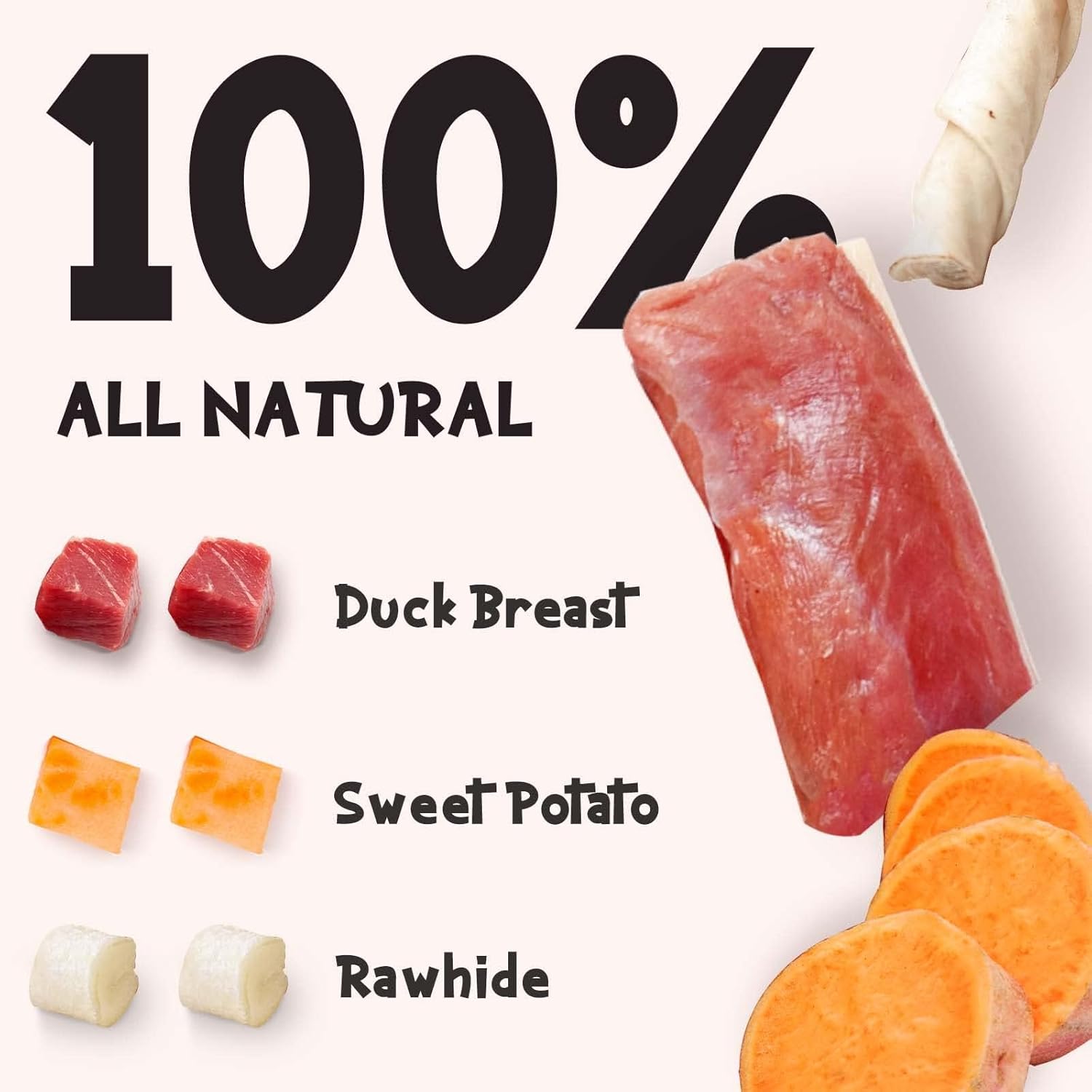 • 3-In-1 DOG TREATS : Made of human-grade duck for dogs as the very first ingredient which wrap with real beefhide and sweet potato inside.