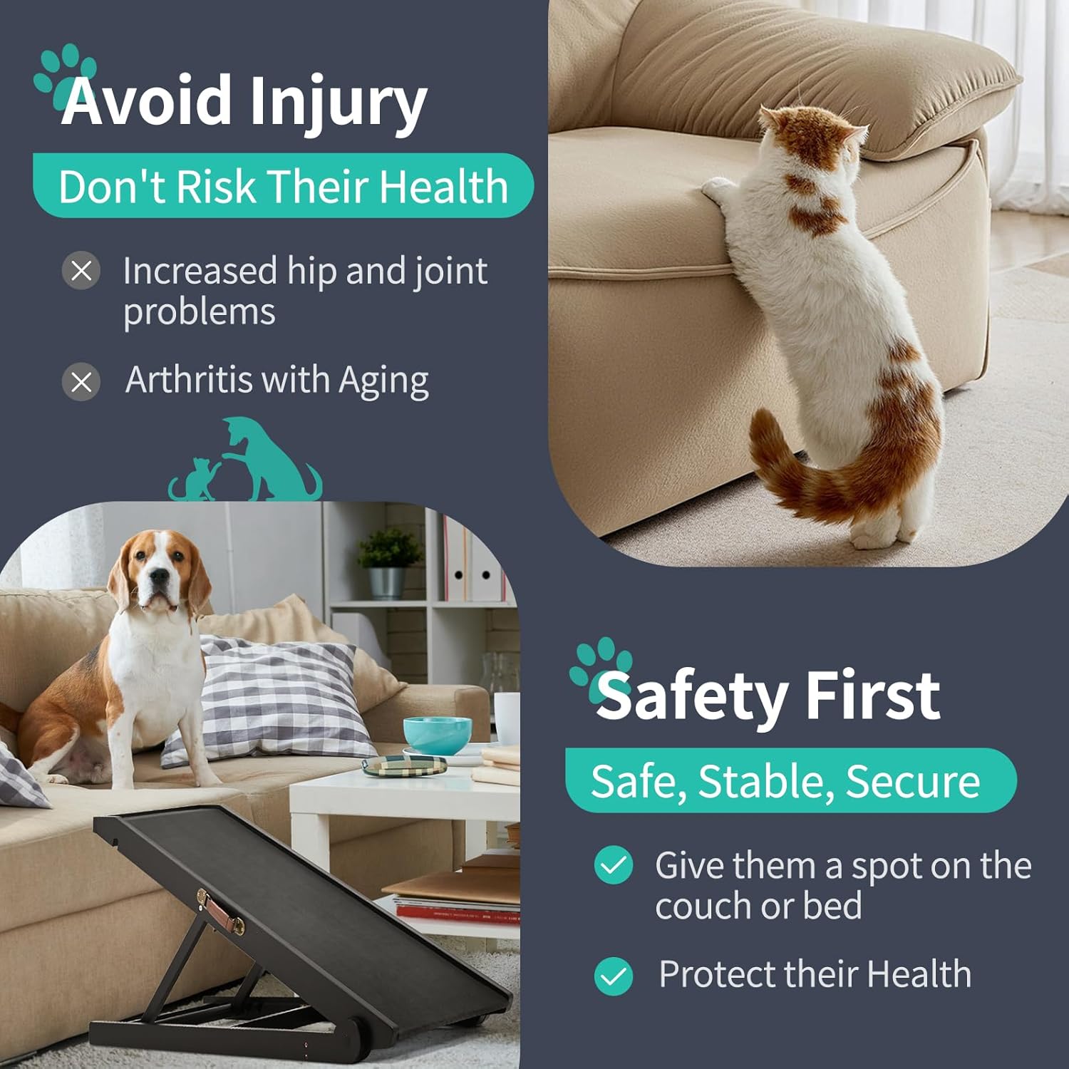 • STURDY & DURABLE: Our pet ramp for dogs and cats is specially made very well - solid wood construction and sturdy stainless steel fasteners, which has been tested to support up to 200lbs. When they jump off the bed, sofa, and sofa, there is no need to worry about getting injured, which provides safety for your pet.