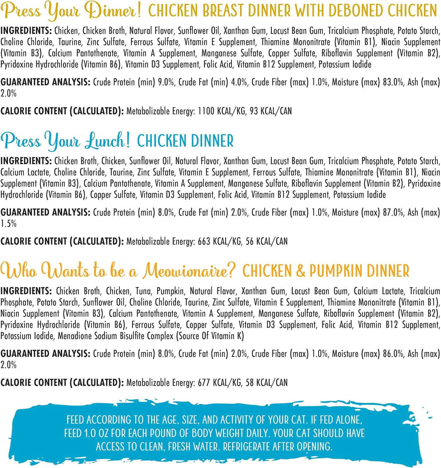 • Weruva Wet Cat Food, The Chicken Lounge Paté Variety Pack 3oz, Pack of 12 includes four (4) of each: Press Your Lunch, Press Your Dinner, Who Wants to be a Meowionaire.