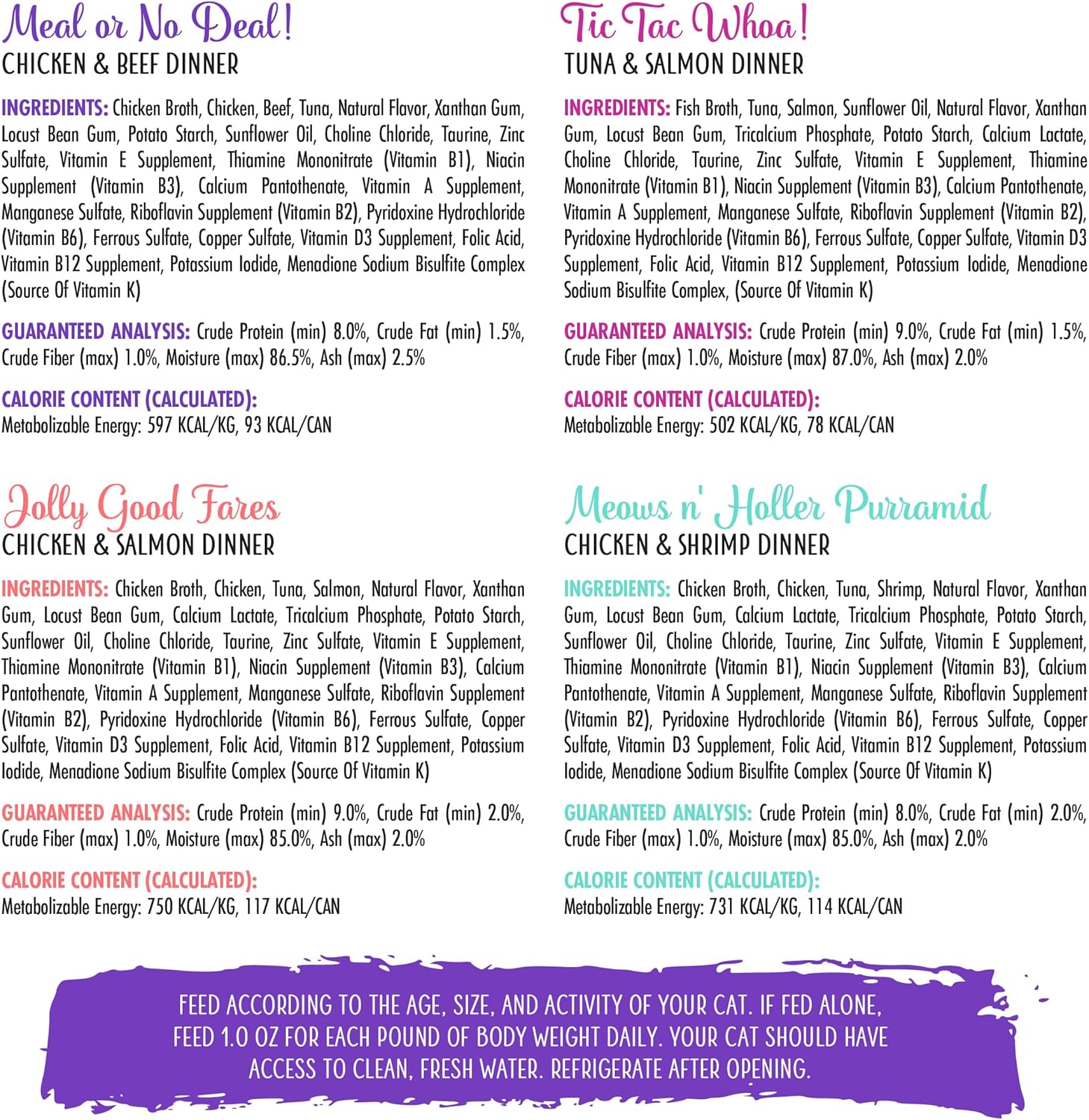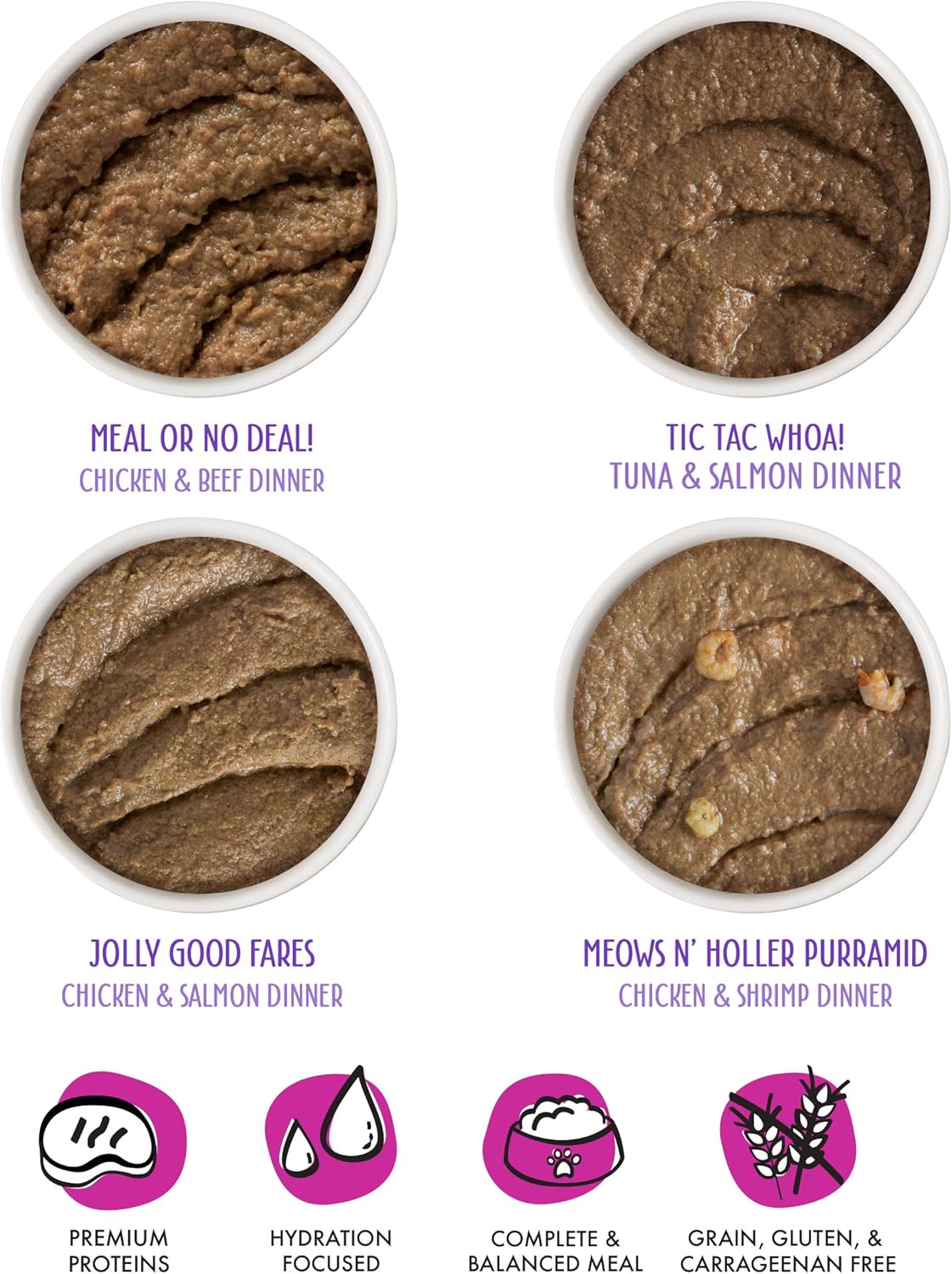 • Weruva Wet Cat Food, Grand Prize Patés Variety Pack 5.5oz, Pack of 12 includes three (3) of each: Meal or No Deal, Tic Tac Whoa, Jolly Good Fares, Meows n' Holler Purramid