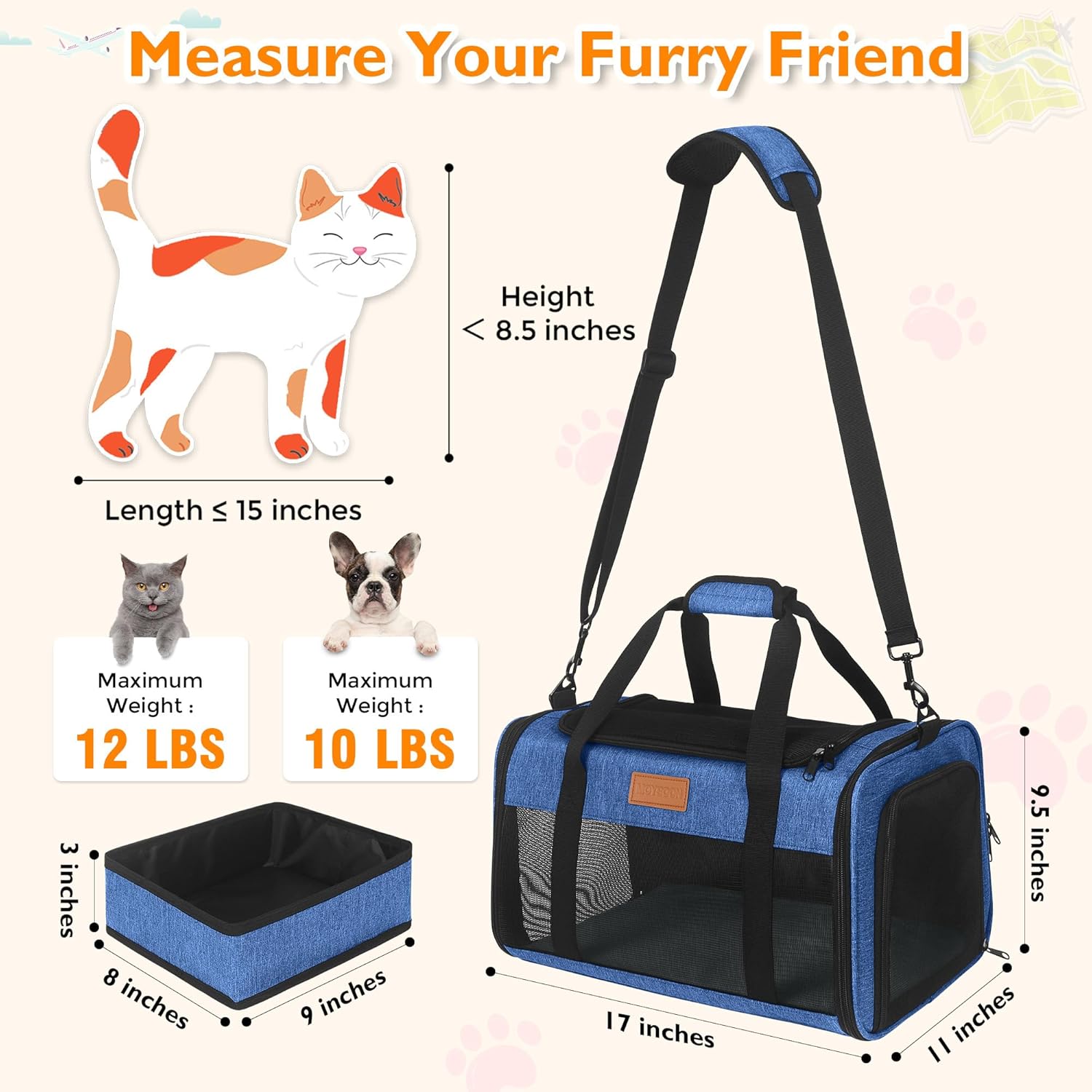 PETUX TSA Approved Pet Carrier in Cabin, 17"x11"x9.5" Soft Cat Carriers for Small Cats up to 12 lb, Top-Open Portable Dog Carrier with Litter Box and Anti-Scratch Mesh for Puppy up to 10 lb (Blue)