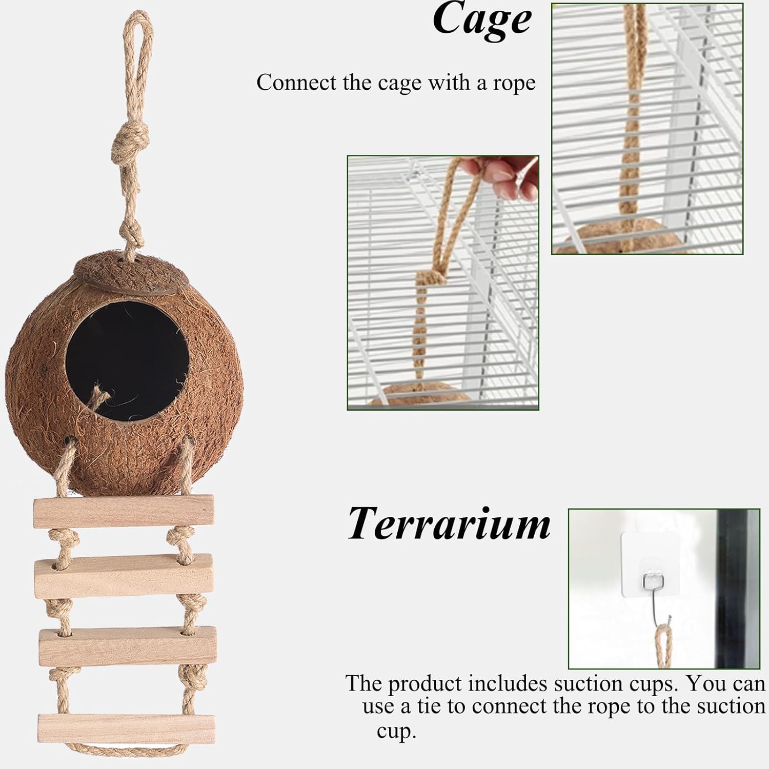 HERCOCCI Gecko Tank Accessories, Hermit Crab Toys Coconut Shell Natural Coconut Husk Hut with Climbing Ladder with Suction Cup for Leopard Gecko Snake Reptiles