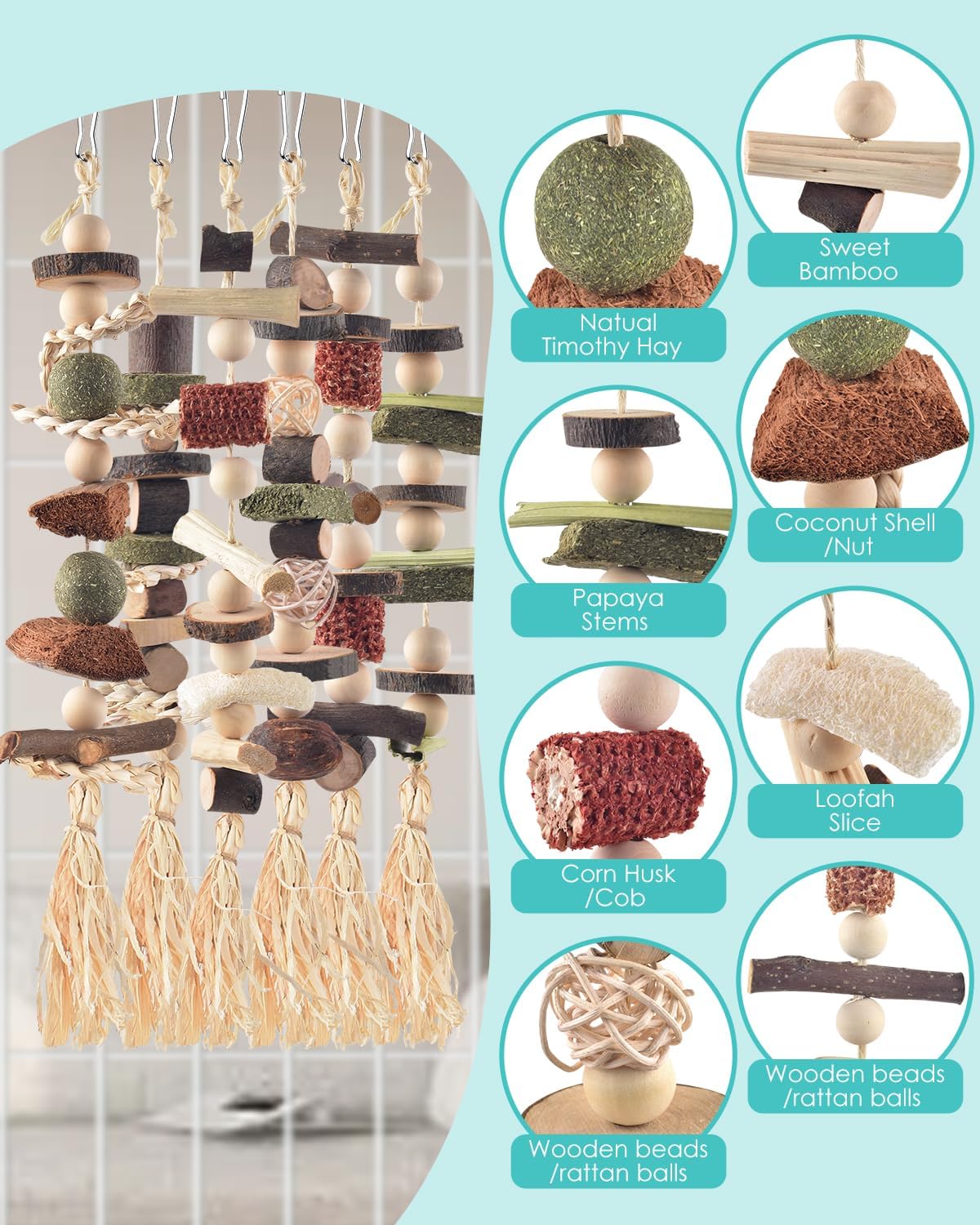 • Natural Materials: DBNESS small animal toys are crafted from 100% natural materials including apple wood, timothy hay, loofah slices, rattan balls, nuts, corn husks/cobs, coconut shells, sweet bamboo, and papaya stems. These bunny toys for bunnies provide safe play and chewing opportunities for your lovely pets. These materials are not only fiber-rich, which helps clean your pet's teeth and promote digestion, but they also aid in exercising and relieving stress