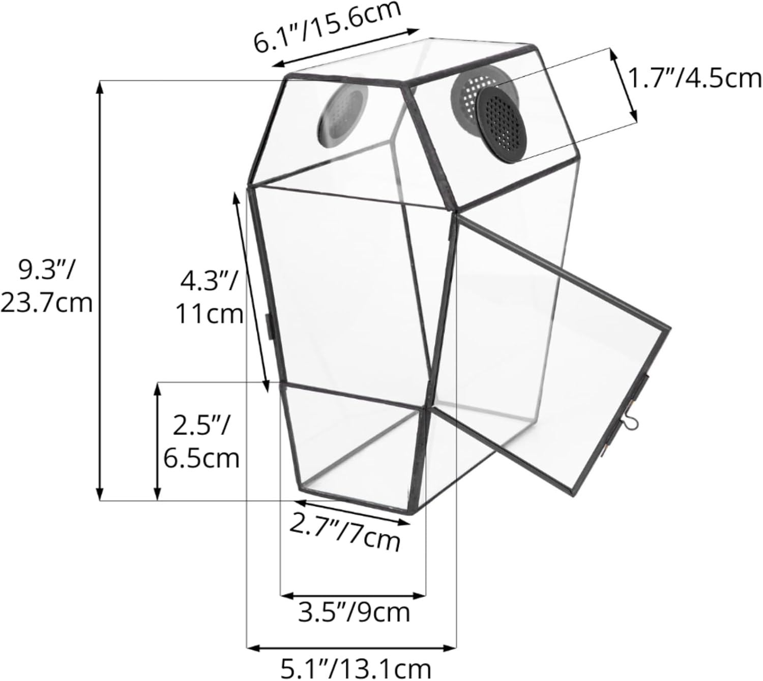 • This is an insect terrarium in a unique coffin-shape with 3 black plastic mesh vents on the roof. It is a perfect enclosure choice for insects like jumping spiders and snails