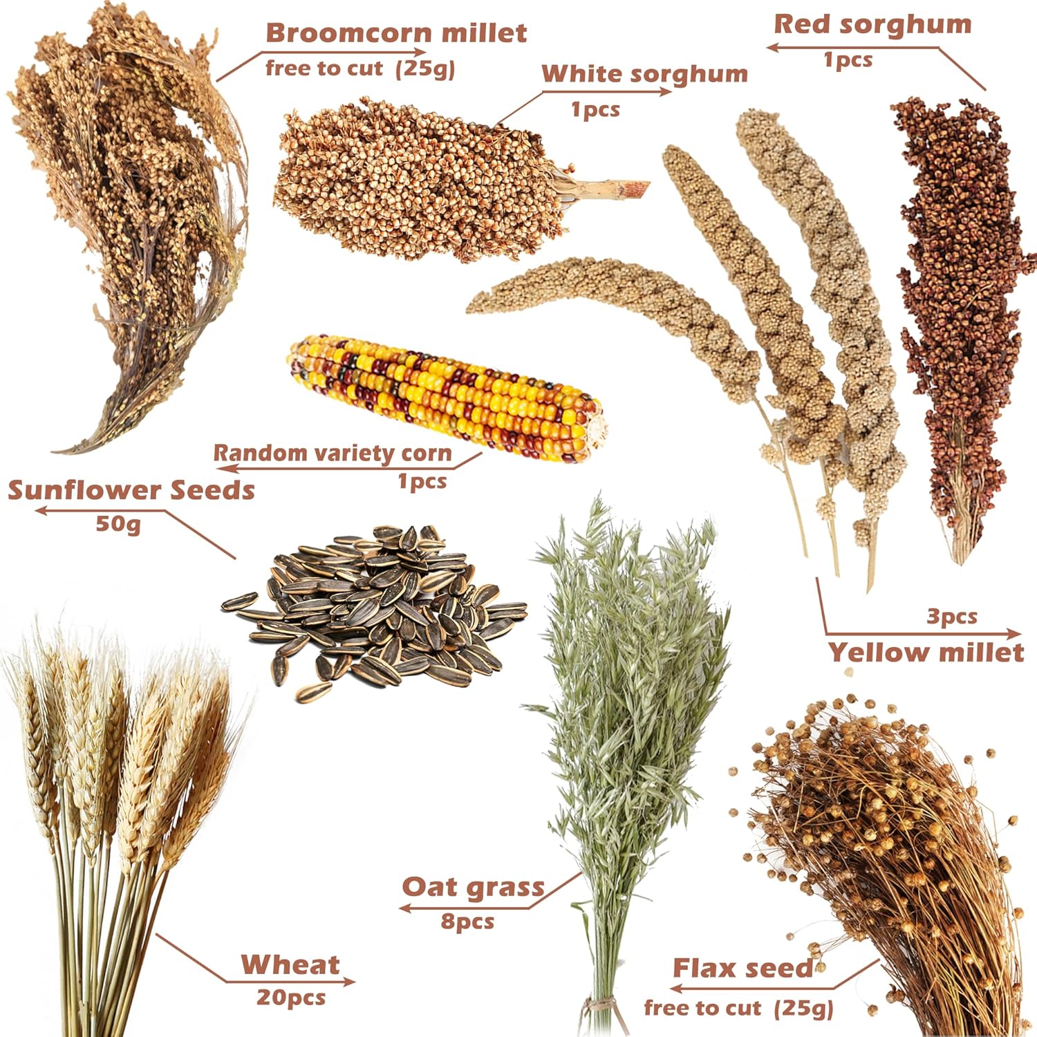 • What you get: You get: Kibble cob - 25g,Corn - 1 stick, Wild oats - 8 sticks, Sorghum - 2 sticks (one each white and red), Yellow cob - 3 sticks, Flax - 25g, Wheat - 20 sticks,Sunflower seeds-50g. These grains not only redecorate the hamster's home, but also provide more different textures to enrich their chewing experience and become new hamster toys to enrich their experience