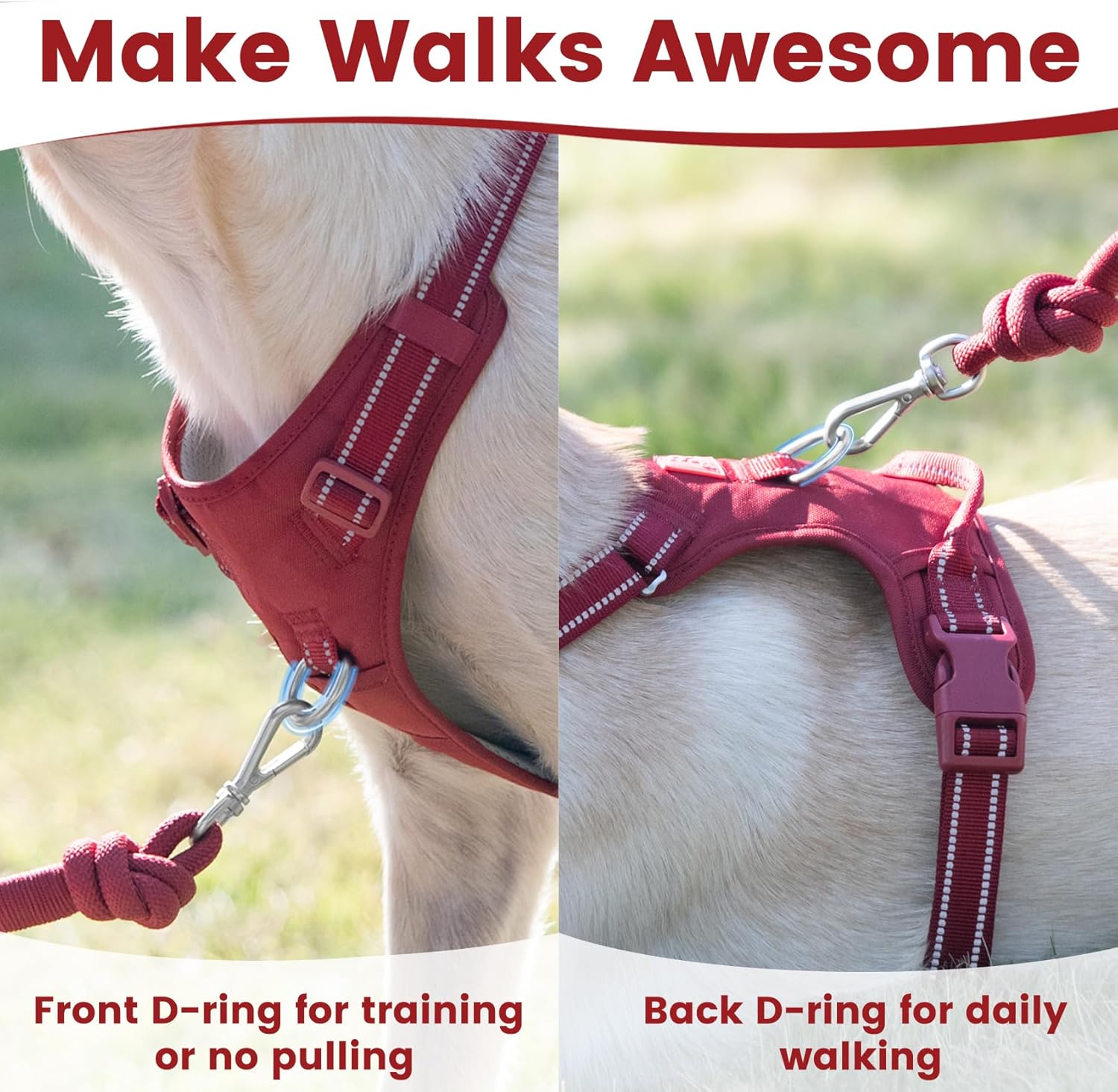• No Pull and No Choke : Features a front D-ring to help guide your dog, reducing pulling and making walks more manageable. Back D-ring for a safe, secure leash attachment, ensuring comfortable and controlled daily walking.