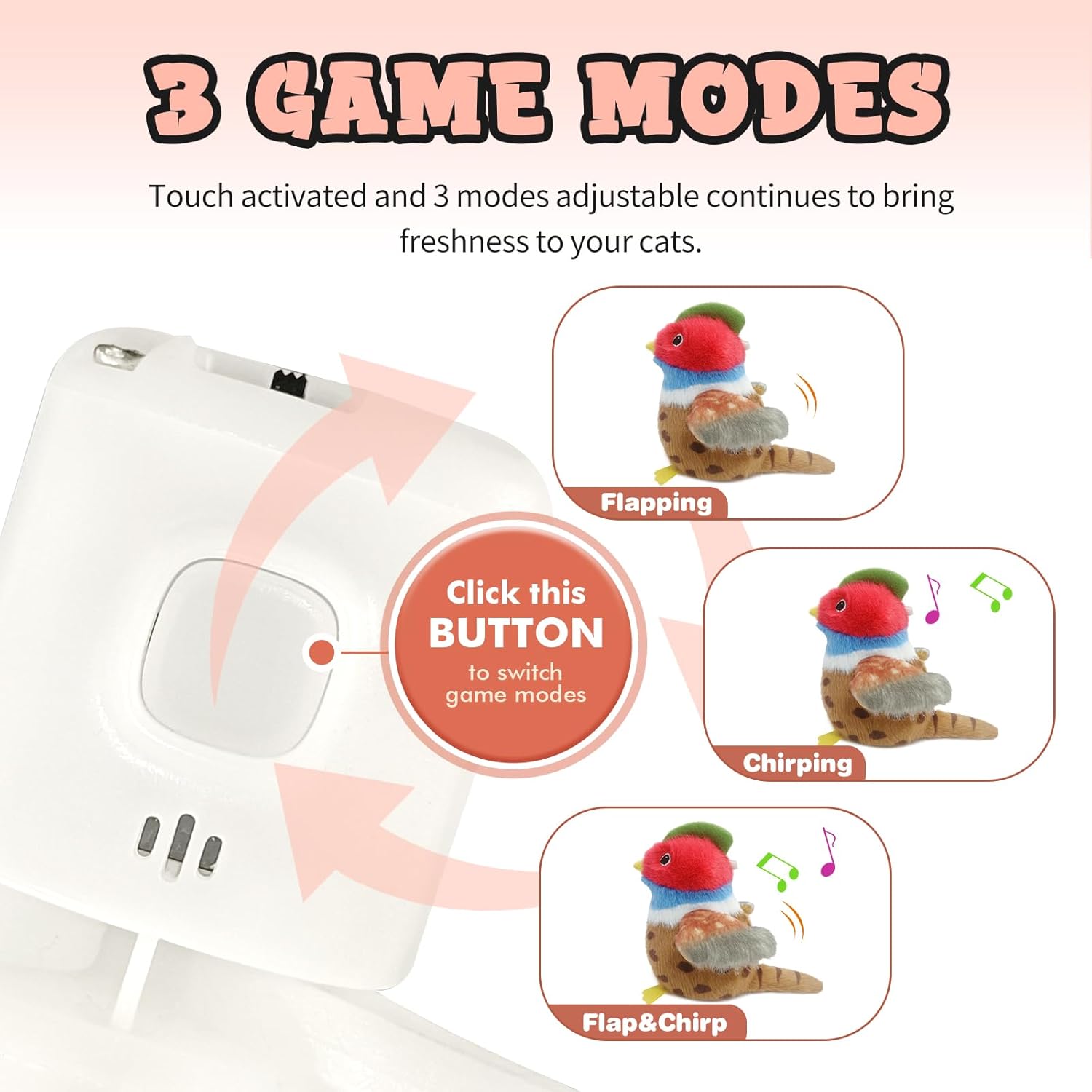 • Multiple Fun:The exterior of the toy is made of soft, safe and bite-resistant plush for your kitten to chew and play. Comes with an extra bag of catnip as a replacement, which can be put into the pheasant's belly to emit scent and enhance the appeal to kittens. 3 adjustable modes:flap, chirp, flap and chirp, which continues to bring freshness to the kitten