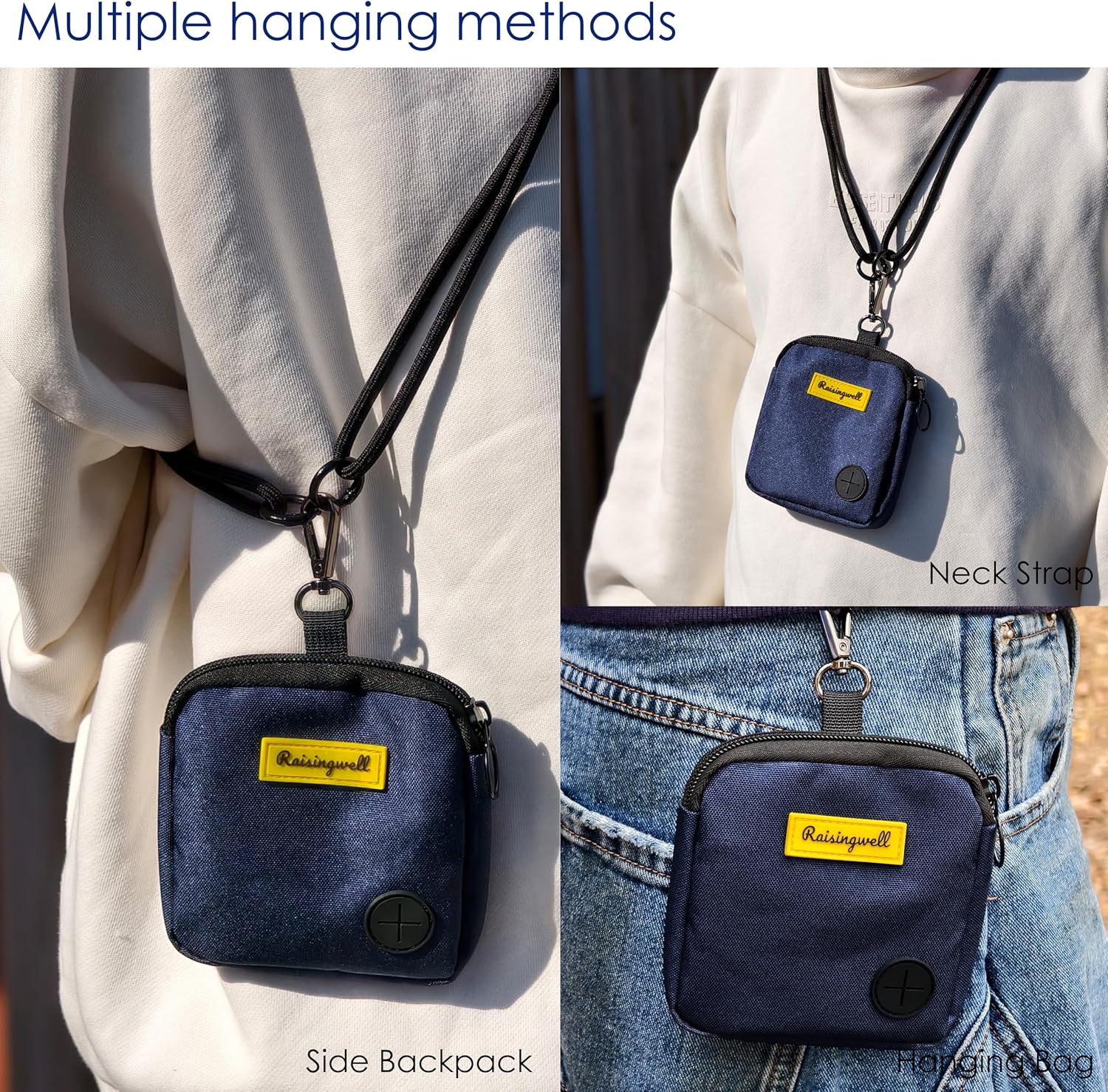 • Raisingwell Dog T1、Fashion Design: This dog training treat bag measures 4.9 x 5.1 inches and offers versatile wearing options. It comes equipped with a carabiner and a strap, allowing you to hang it on your leash, attach it to your pet's collar, or even wear it as a trendy accessory on your bag. The bag features a zipper closure, ensuring that treats stay secure inside even when you're playing with your pet afterward. It's perfect for carrying around or using during short outings.reat Pouch