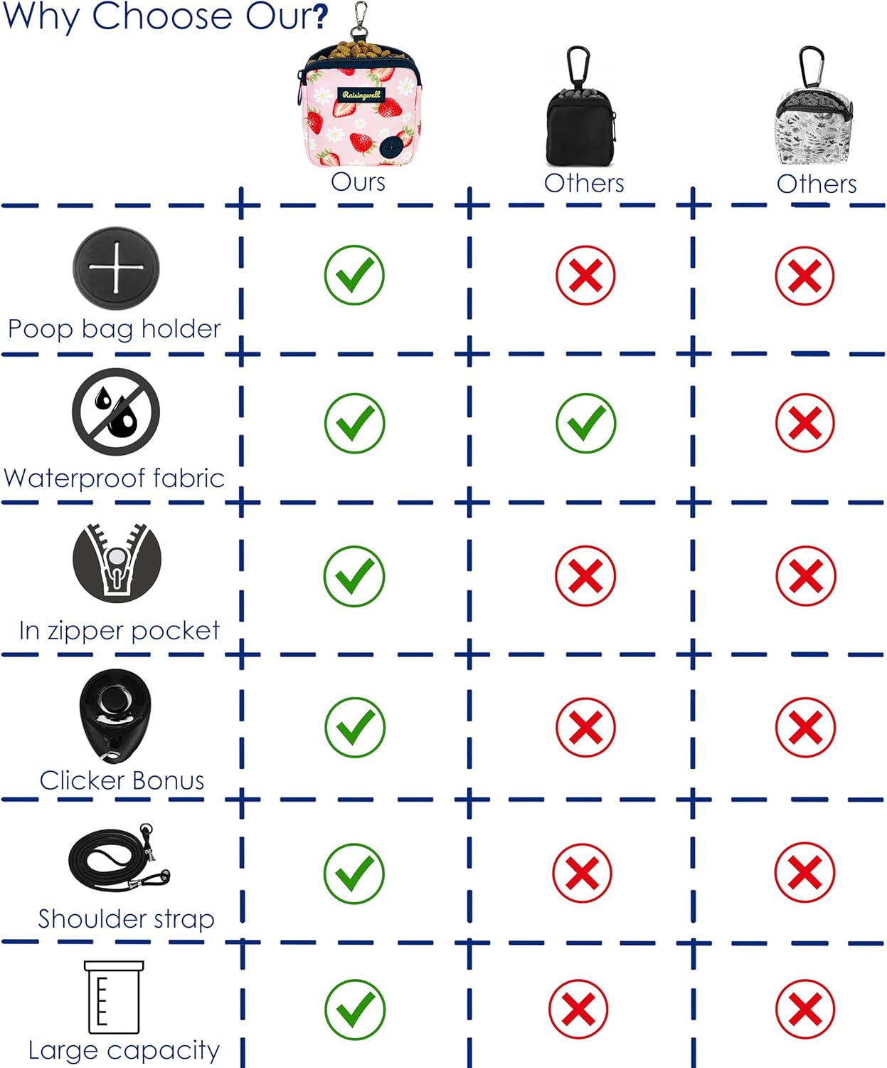 • Raisingwell Dog T1、Fashion Design: This dog training treat bag measures 4.9 x 5.1 inches and offers versatile wearing options. It comes equipped with a carabiner and a strap, allowing you to hang it on your leash, attach it to your pet's collar, or even wear it as a trendy accessory on your bag. The bag features a zipper closure, ensuring that treats stay secure inside even when you're playing with your pet afterward. It's perfect for carrying around or using during short outings.reat Pouch