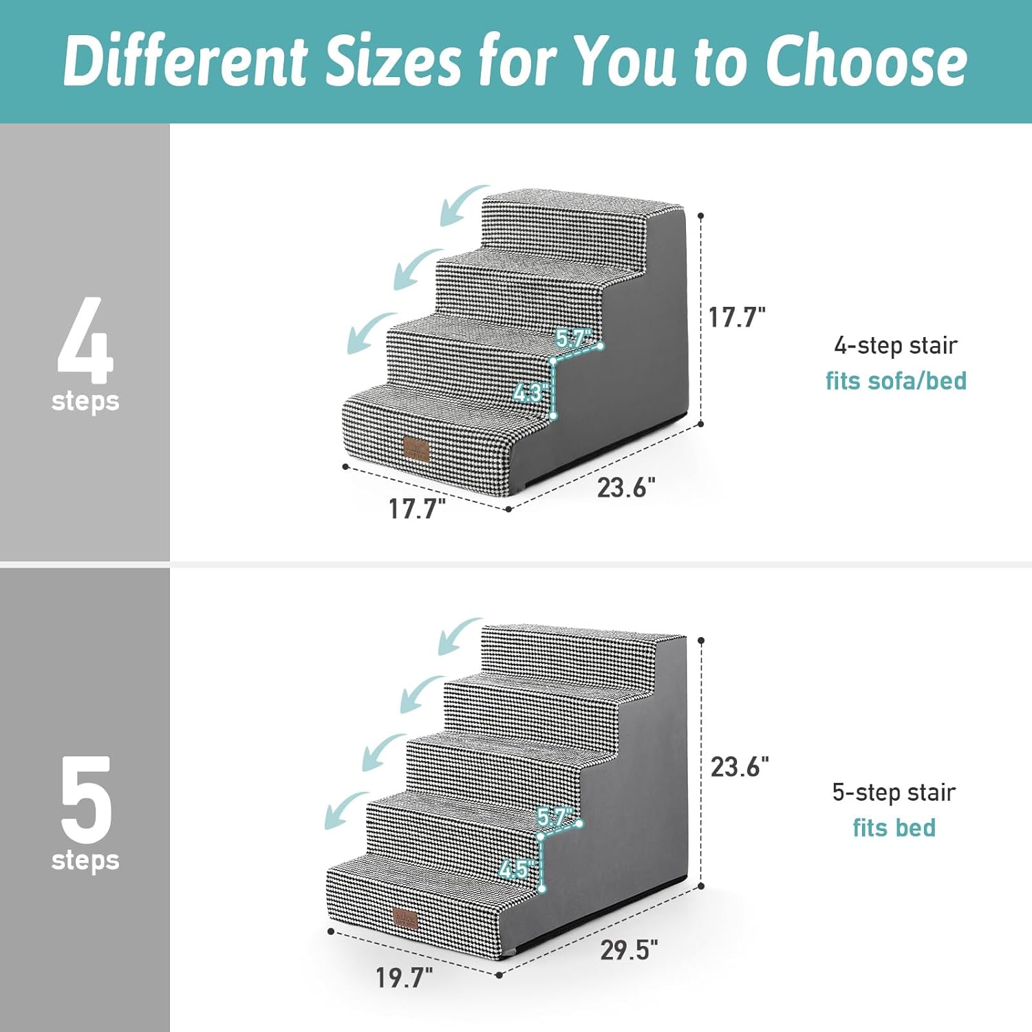 • Multiple Options: The dog stairs for small dogs are available in 4-step or 5-step, with various color choices to suit your needs. The 4-step stairs are ideal for sofas and low beds, while the 5-step dog ramp is better suited for high beds and car trunks.