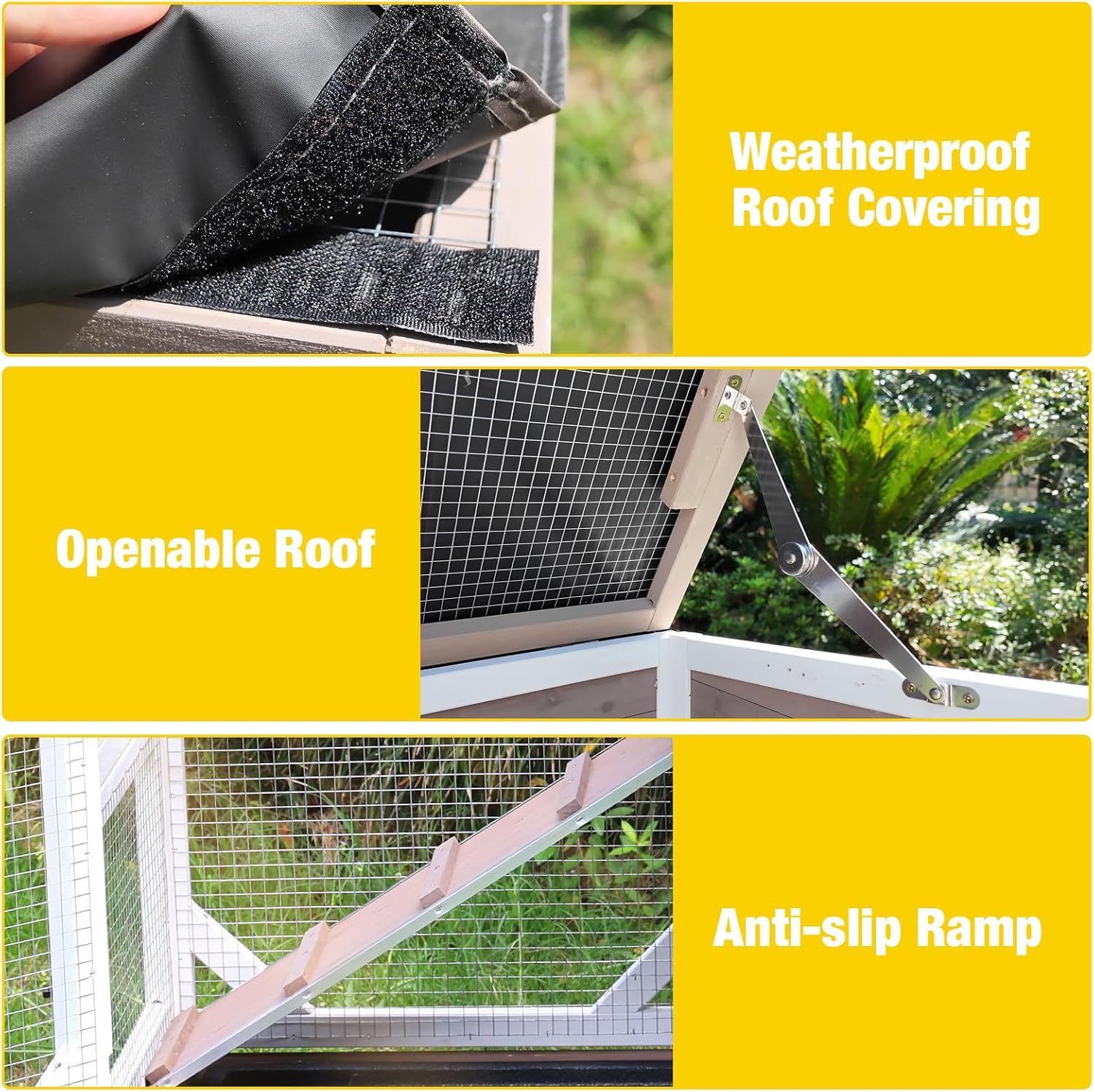 • Openable Roof: The openable roof provides convenient access for feeding and interaction. Additionally, the waterproof roof covering protects your pet from the elements and also provides shade on summer days making rabbit hut suitable for both indoor and outdoor use