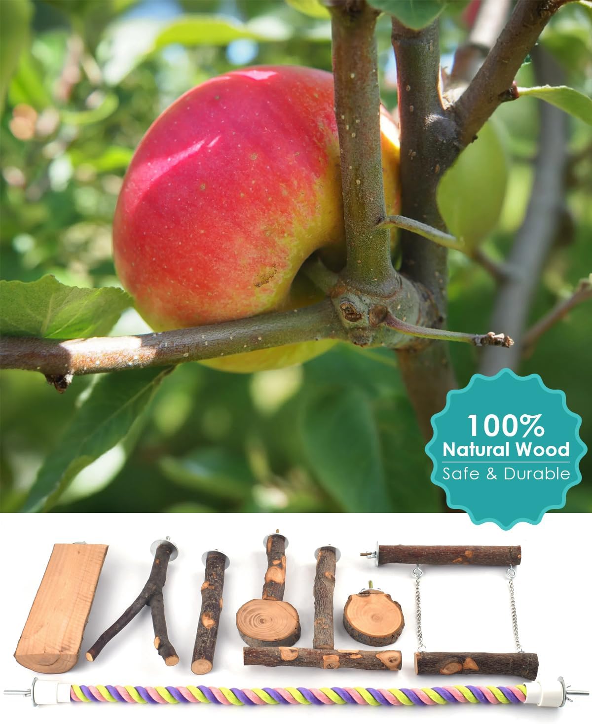• Bird Cage Accessories: bird wooden perches set includes 1 Bird Swing, 1 Combo T-Shaped Perch, 1 Combo Oblong Round Platform, 1 Y-Shaped Perch, 1 Square Platform, 1 Round Platform, 1 Wooden Perch and 1 Bird Rope. Note: Due to the fact that the perches are made of natural apple wood, individual shapes may vary