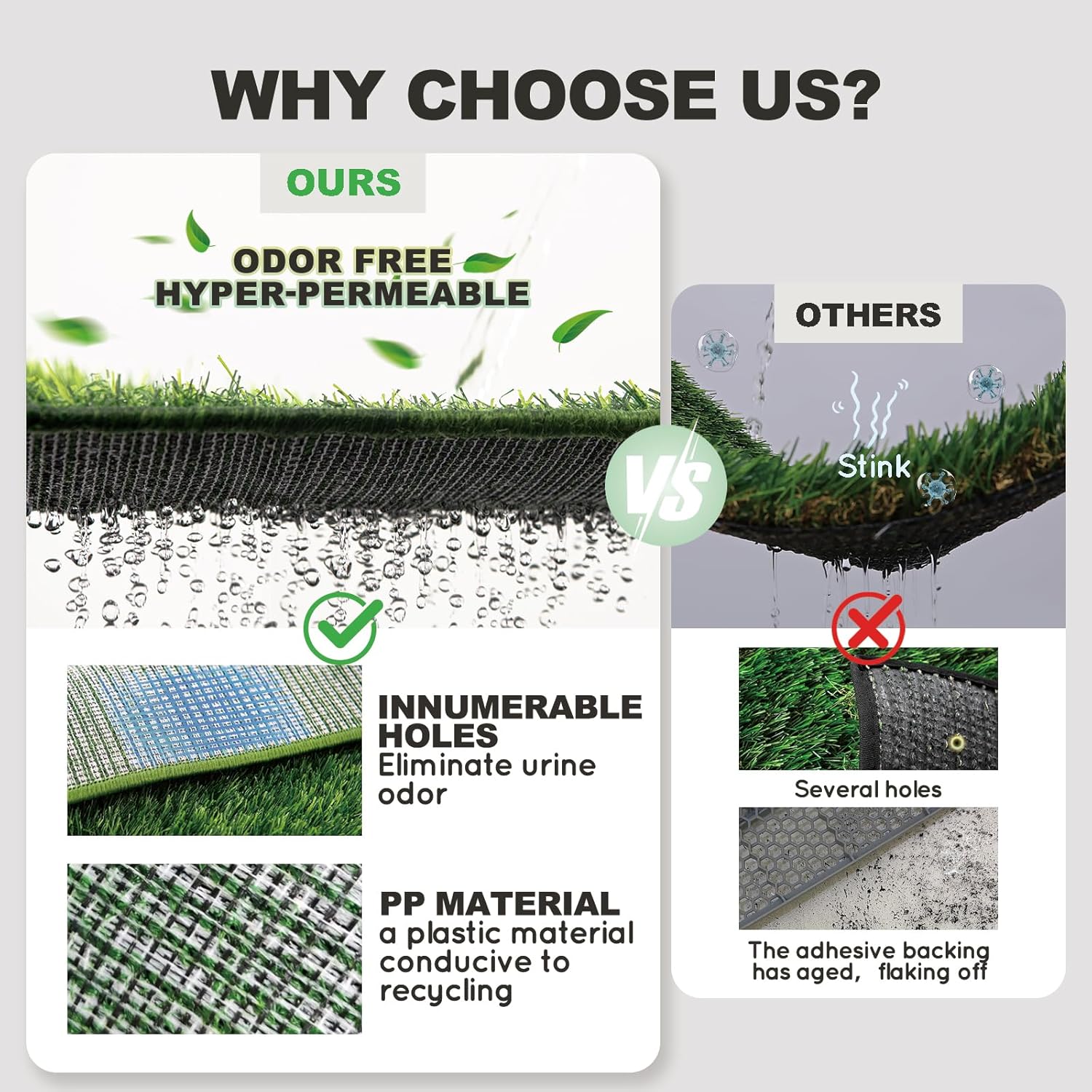 • MACHINE WASHABLE & UTTRA-Absorbent ARTIFICIAL GRASS & ODOR FREE : The new generation of ultra-absorbent dog potty grass pad is knited and melted in order to reduce urine stink, so no black rubber bottom. Urine can instantly flow into the foldable liner base below.