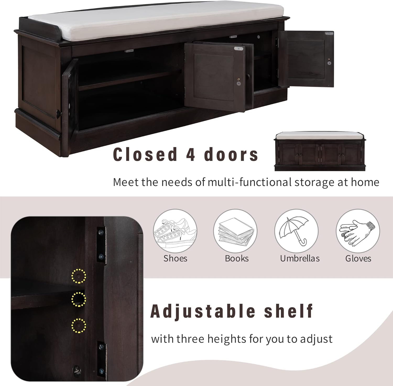Shoe Storage Bench with 4 Doors and Adjustable Shelves, Shoe Bench with Removable Cushion for Living Room Entryway 42.7" L * 16" W * 17.4" H Espresso
