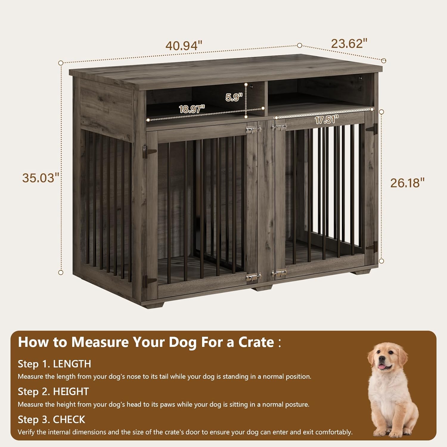 • [Durable Build & Supports Puppy's Growth] Crafted from sturdy wood and heavy-duty steel bars, the dog crates for medium dogs offers lasting strength. Reinforced latches secure your "escape artist"