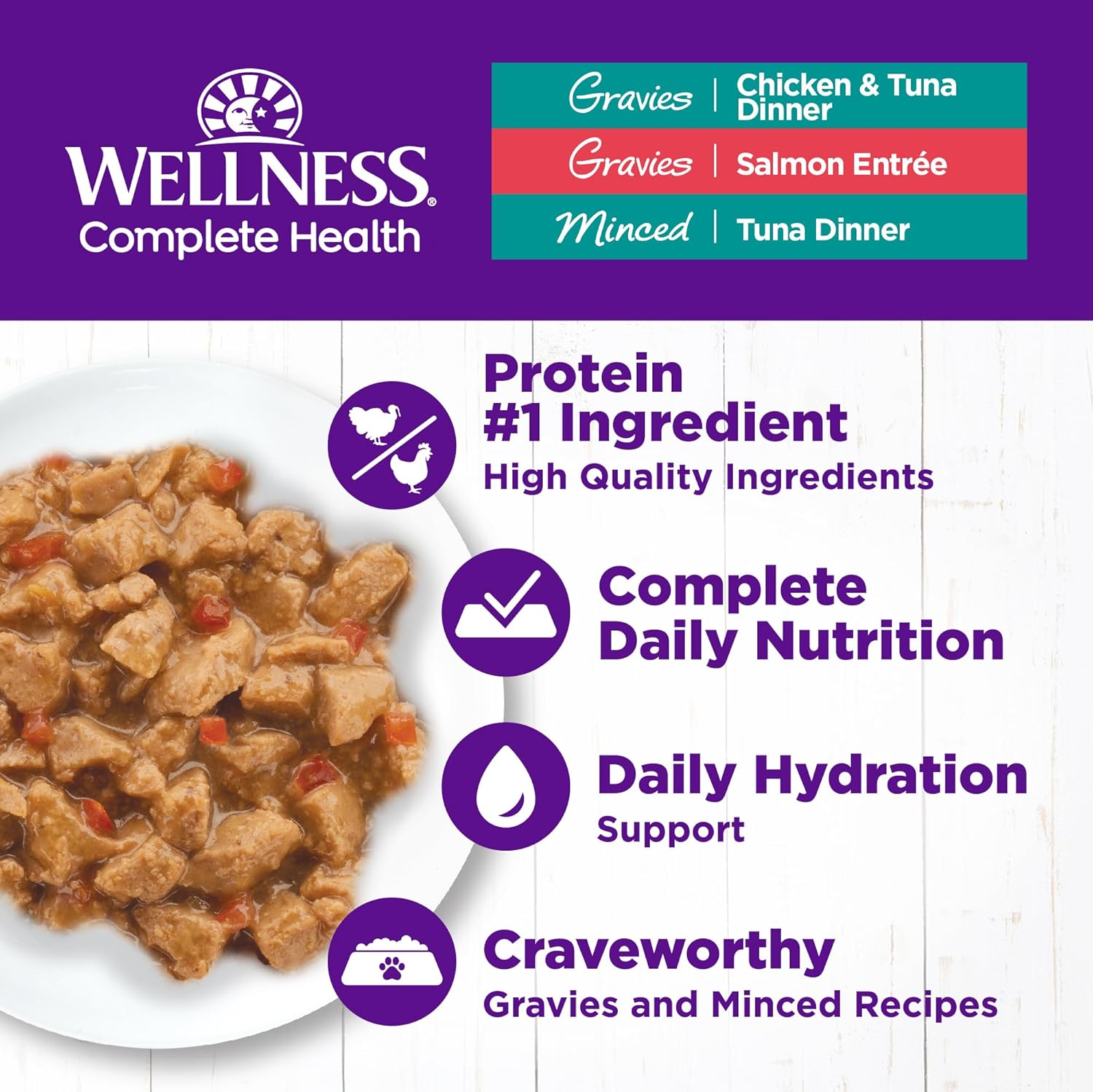 Wellness Complete Health Gravy & Minced Adult Wet Cat Food, Natural, Protein-Rich, Grain Free, 3 Ounce, 12 Pack, (Salmon, Tuna, and Chicken Variety Pack)
