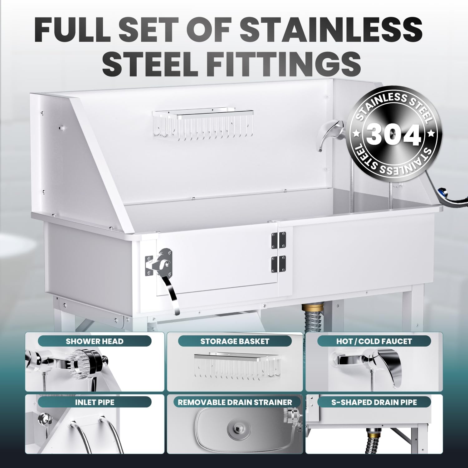 • Built to withstand up to 220 pounds, our dog washing station for home features a powerful drainage system. Whether indoors or outdoors, it fits seamlessly into utility rooms, garages, pet stores, and veterinary clinics. Versatile and durable, this dog grooming tub and dog bathing station are designed to provide a convenient and efficient bathing experience in various settings