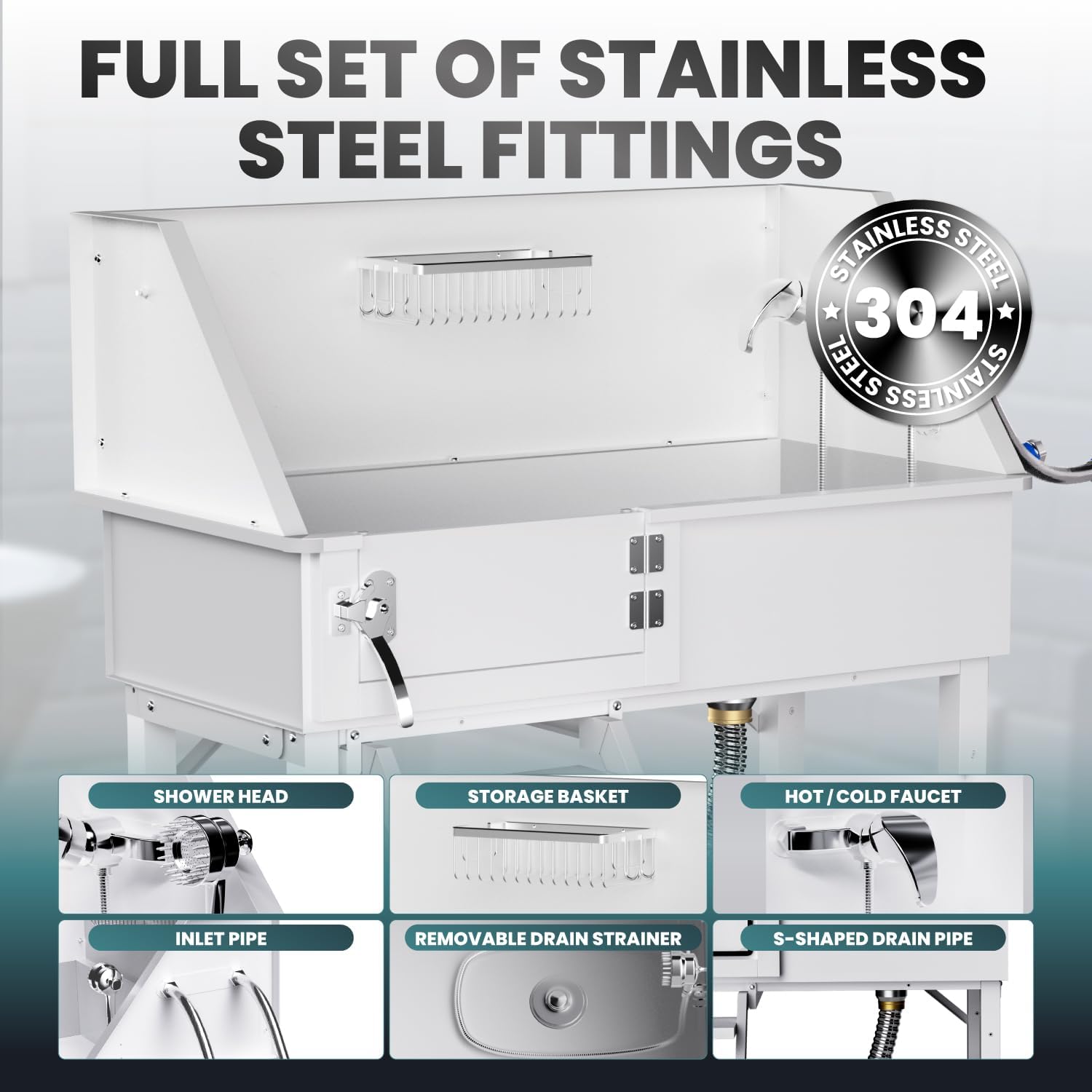 • Built to withstand up to 220 pounds, our dog washing station for home features a powerful drainage system. Whether indoors or outdoors, it fits seamlessly into utility rooms, garages, pet stores, and veterinary clinics. Versatile and durable, this dog grooming tub and dog bathing station are designed to provide a convenient and efficient bathing experience in various settings