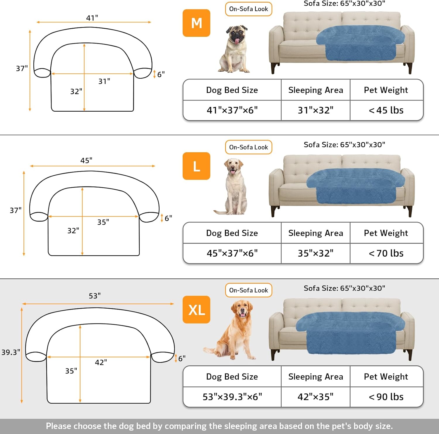 • 【Multiple Size Selection】The couch pet bed has 5 sizes for you to choose from. M: 41"x37" dog bed for medium dogs. L: 45"x37" dog bed for large dogs. XL: 53"x39.3" dog bed for large dogs. We have enlarged the sleeping area for pets to give dogs more space.