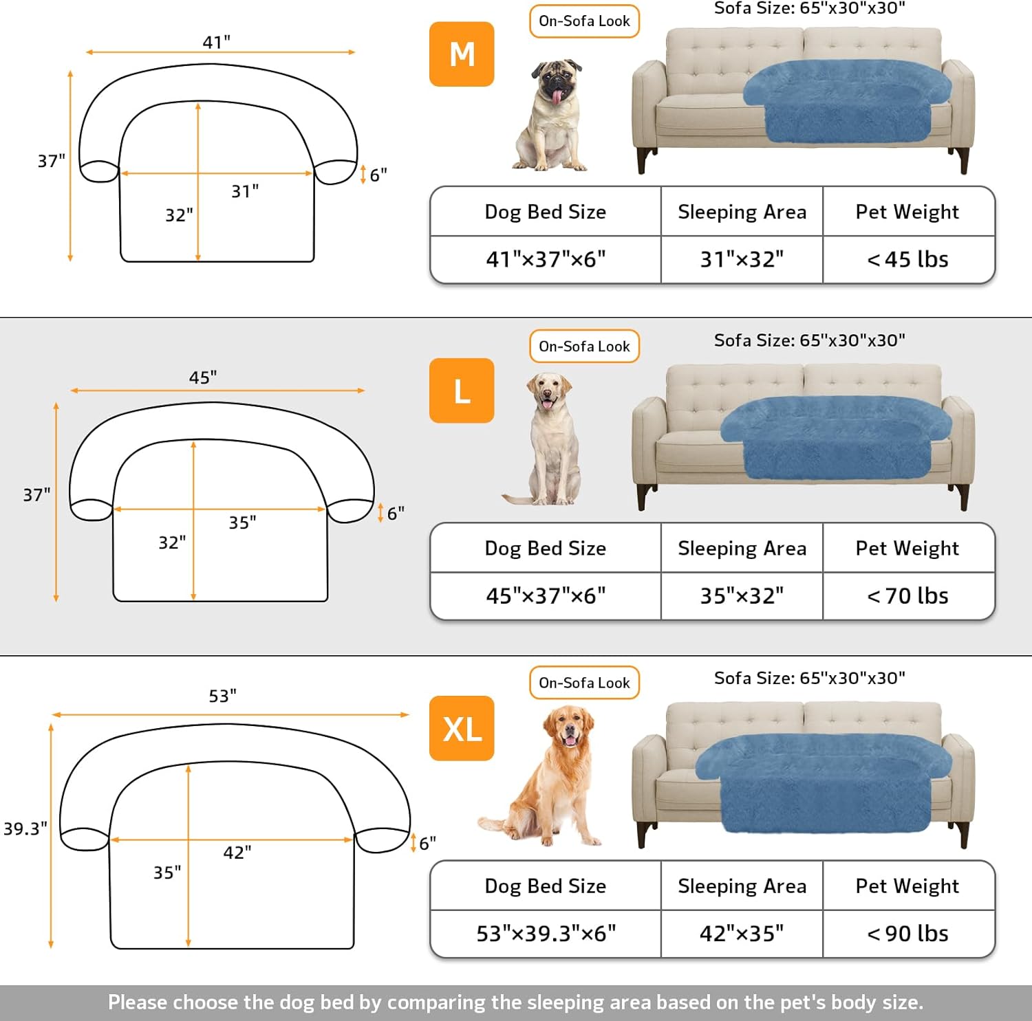 • 【Multiple Size Selection】The couch pet bed has 5 sizes for you to choose from. M: 41"x37" dog bed for medium dogs. L: 45"x37" dog bed for large dogs. XL: 53"x39.3" dog bed for large dogs. We have enlarged the sleeping area for pets to give dogs more space.