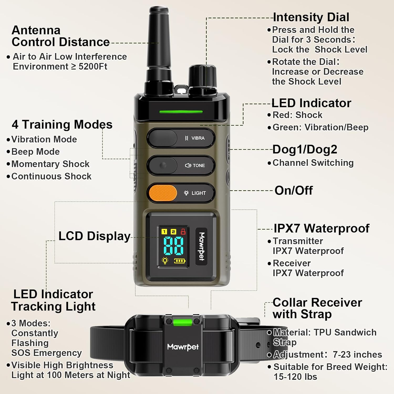 Dog Training Collar with Remote-5200FT, Dog Shock Collar with IPX7 Waterproof, Shock, Vibration, Beep, E-Collar for Dogs Training, Rechargeable, Suitable for All Breeds of 15-120lbs