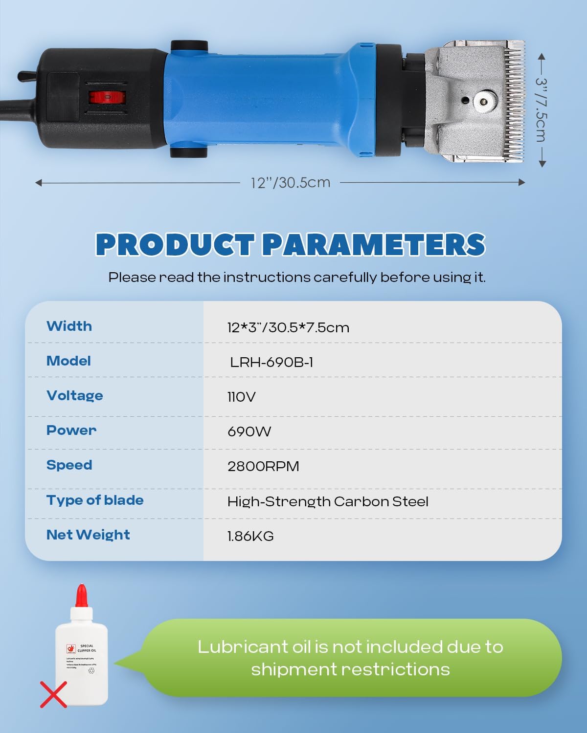 - [690W HIGH POWER]: 690W high power motor made of high temperature resistant all copper wire set with 2800RPM speed, featuring ultra-low power consumption, ultra-high temperature resistance, powerful output and long machine life. Tailored to meet the needs of a farm, this heavy duty horse clipper can handle 3-5 horses per hour, and is versatile enough to trim cattle, sheep, mules, donkeys, and large dogs. For small cats, dogs and other small animals, we do not recommend using this clipper.
