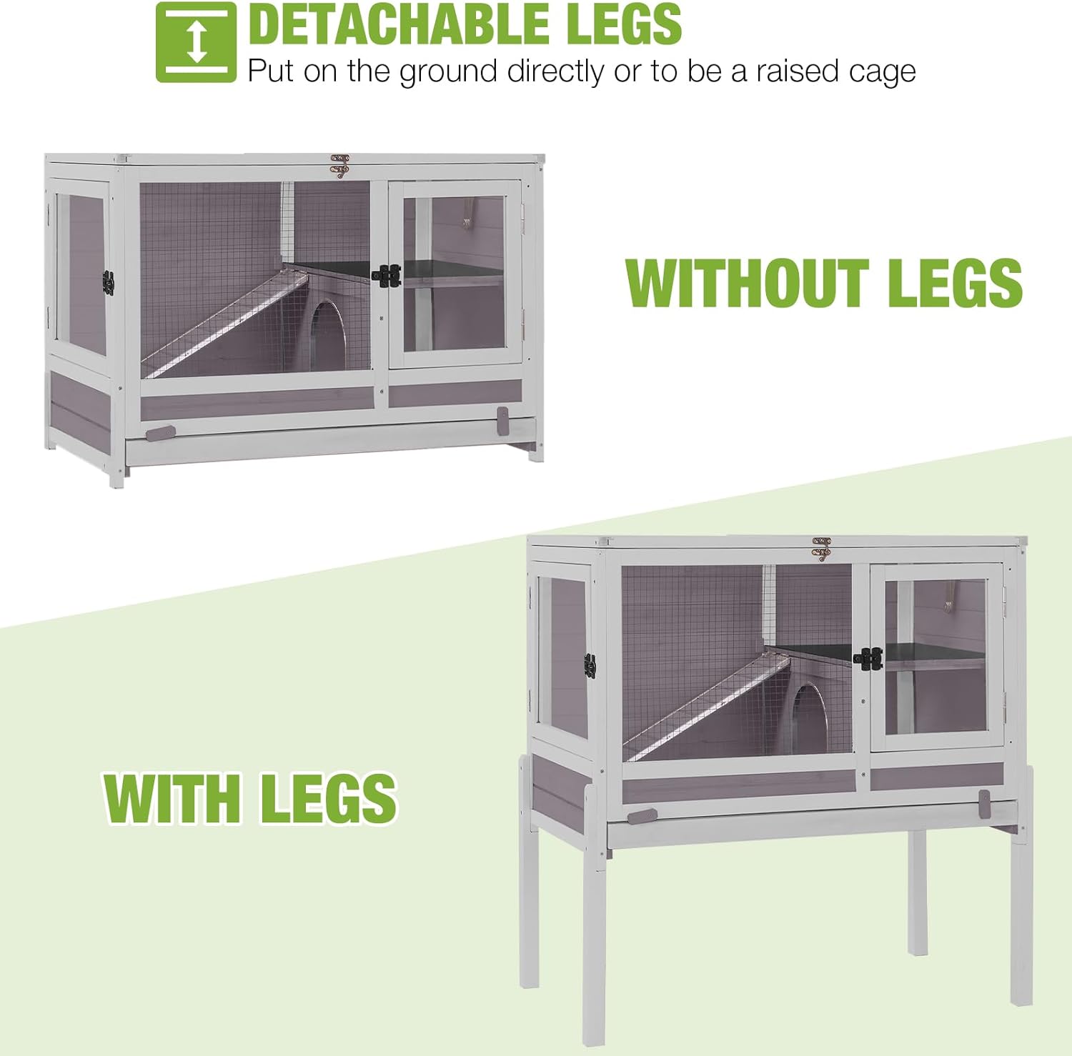 • Adjustable And Removable Legs: Comes with sturdy, removable legs for versatile placement. Use as a free-standing bunny cage or on a flat surface