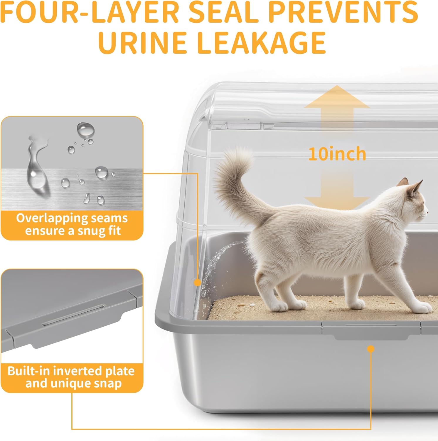 • 【Your Ideal Stainless Steel Litter Box 】 Extra-large stainless steel cat litter box, its large capacity suits cats of all sizes. The 6 - inch high - side and 4 - inch top cover, ensure 100% urine - proof. Our metal cat litter box is easy to clean, it doesn’t hold odors or cling to waste.