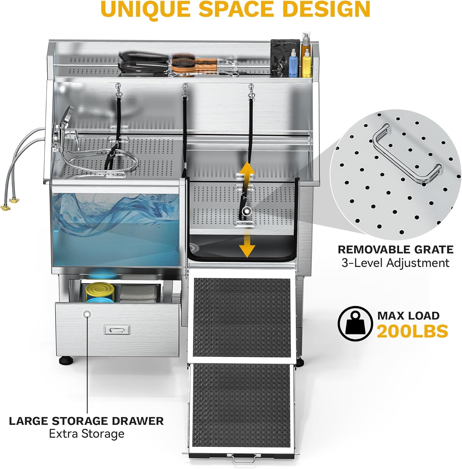 • Easy Entry: The foldable, slide-out ramp of our pet washing station also be used as a secure door, enhancing pet safety; It comes with a 3-tier, 2-piece adjustable grate that can hold up to 200lb, facilitating pet entry and exit