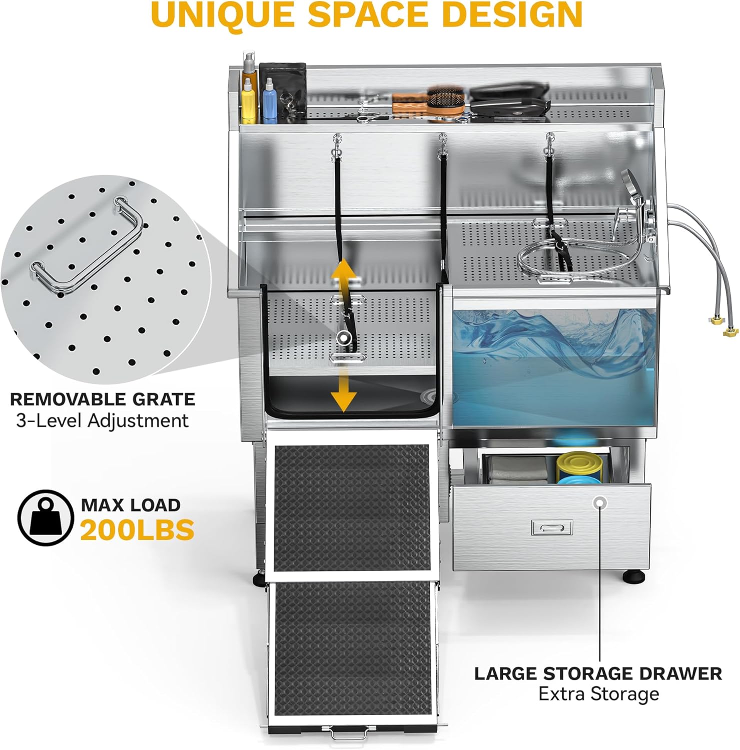 • Easy Entry: The foldable, slide-out ramp of our pet washing station also be used as a secure door, enhancing pet safety; It comes with a 3-tier, 2-piece adjustable grate that can hold up to 200lb, facilitating pet entry and exit