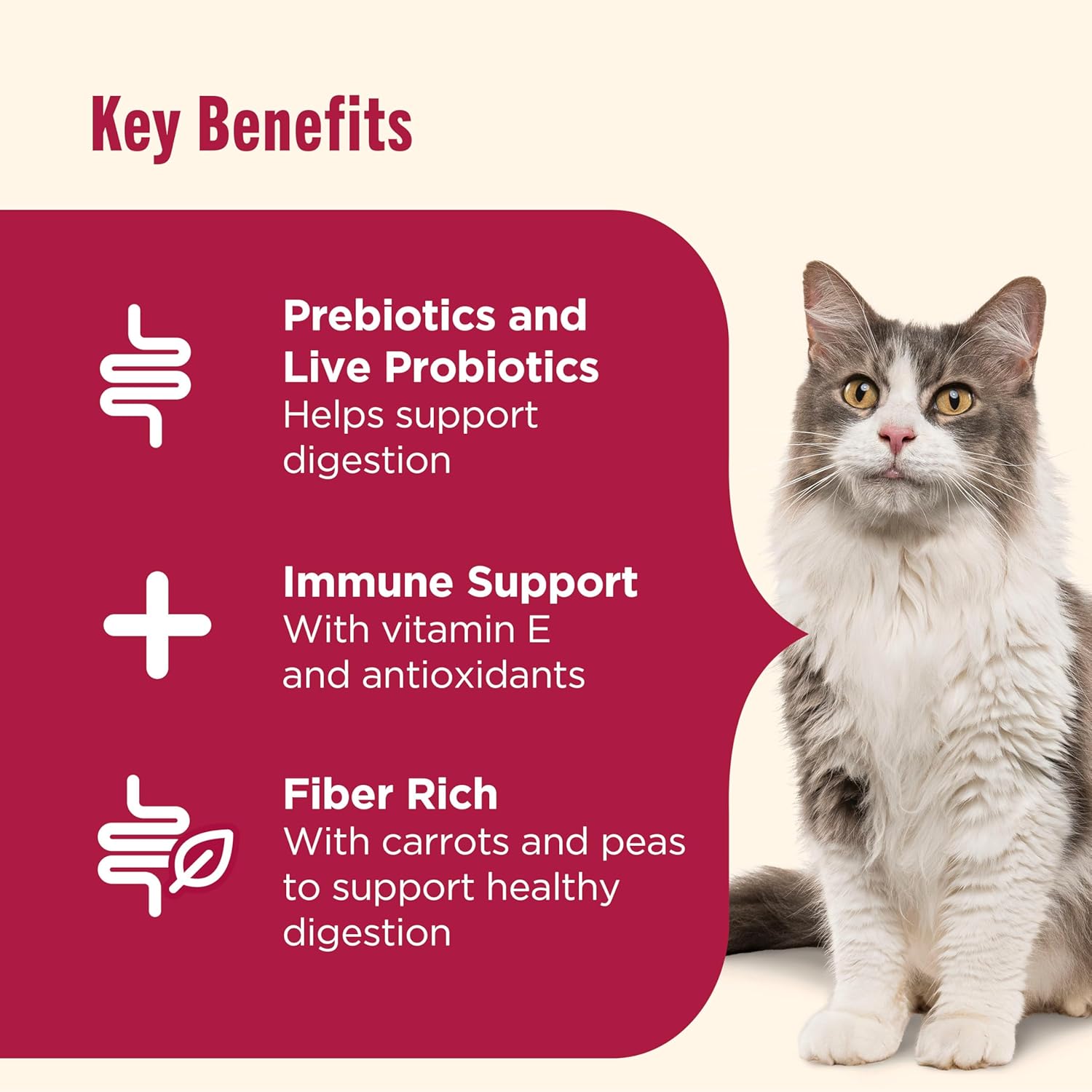 • HEALTHY DIGESTION: Cat food made with prebiotics and live probiotics plus fiber rich peas and carrots to proactively support healthy digestion