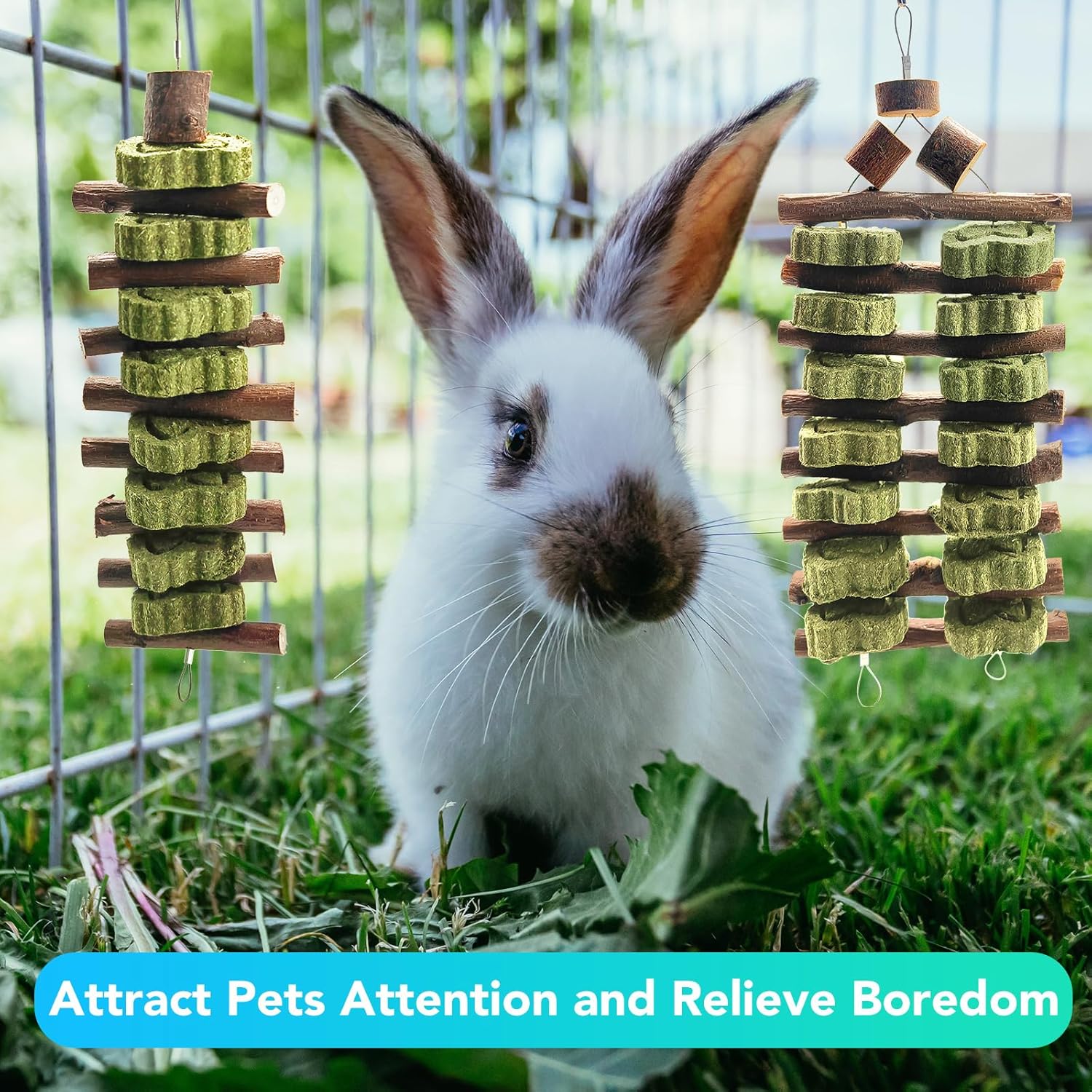 • Fun string hanging design, inspiring vitality -- detachable grass cakes and peach wood blocks can be flexibly combined and hung in cages or held for interaction, satisfying the exploratory nature of rabbits and reducing the need for disassembly.