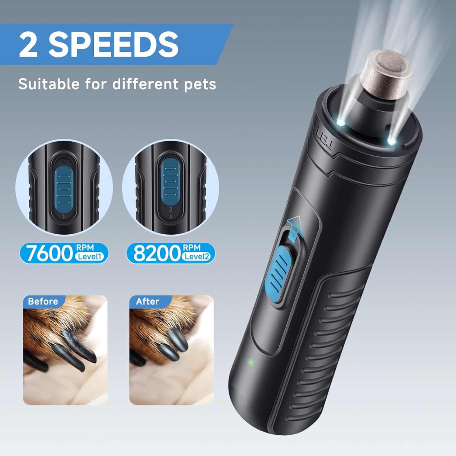 • Powerful Motor & 2-speed switch: 2-speed switch provides you with two rotation modes with high and low speed, so you may decide to start grinding qucikly according to the hardness of your pets' nail.