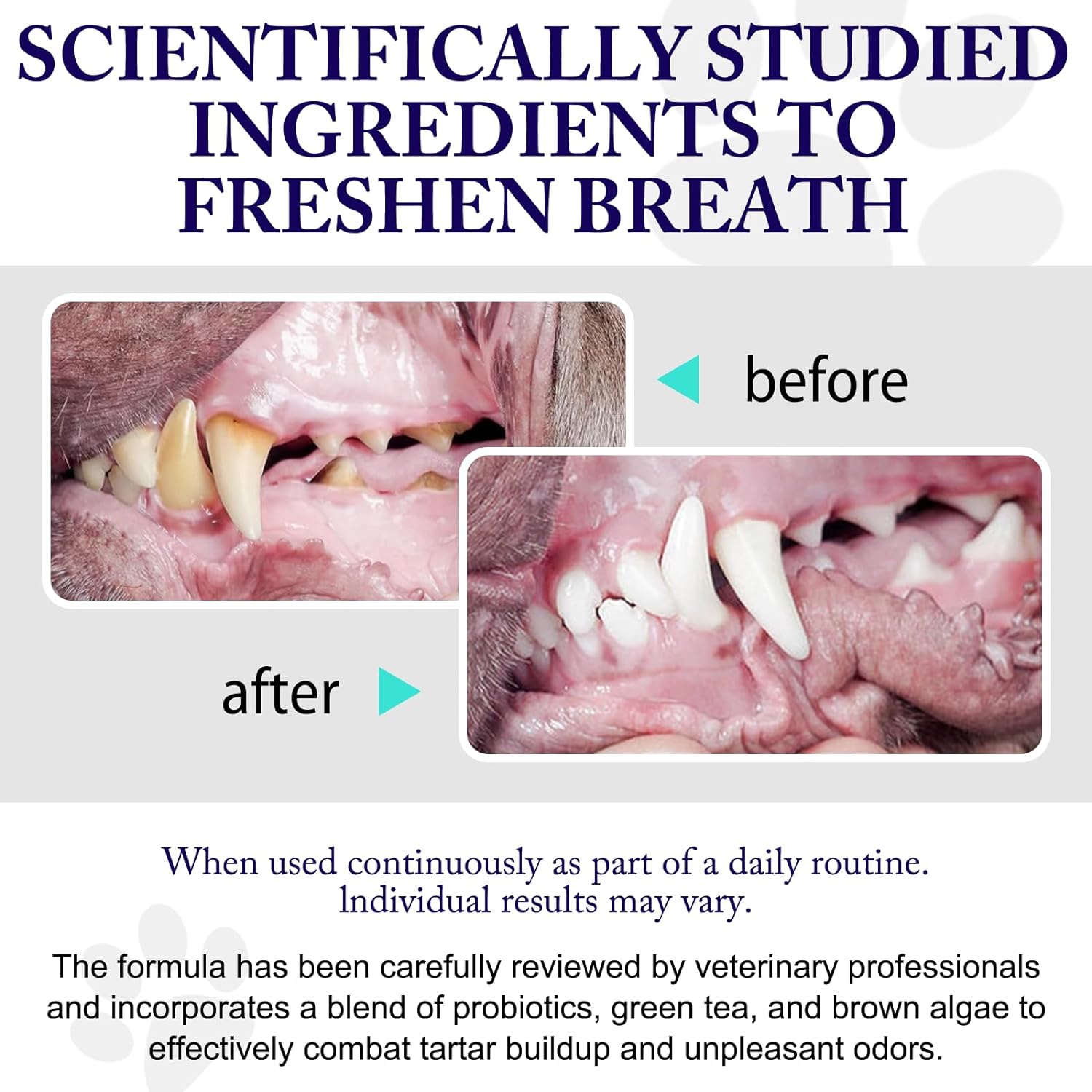• Next Generation Dental Care - teeth cleaning powder features a proprietary blend of probiotics, revolutionizing oral care for dogs. Say goodbye to the hassle of toothpaste, brushing, and dental sticks with our vet-reviewed, one-scoop dog dental powder.
