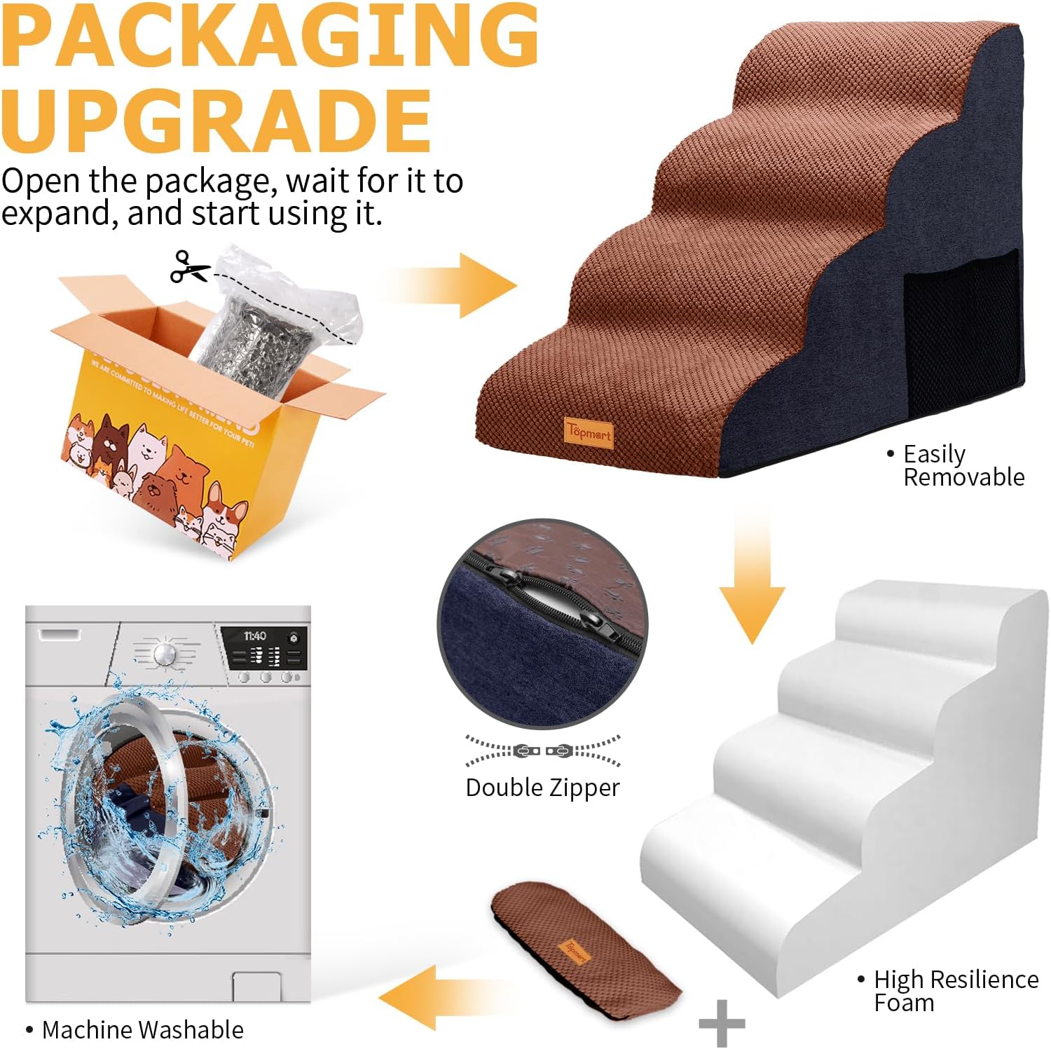 • High Quality Sponge: Made of 30D high-density sponge, strong resilience, not easy to deformation. Soft sponge provides a very comfortable touch to the pet. Even if the pet runs and plays or human accidentally hit the Topmart dog stairs will not be injured.