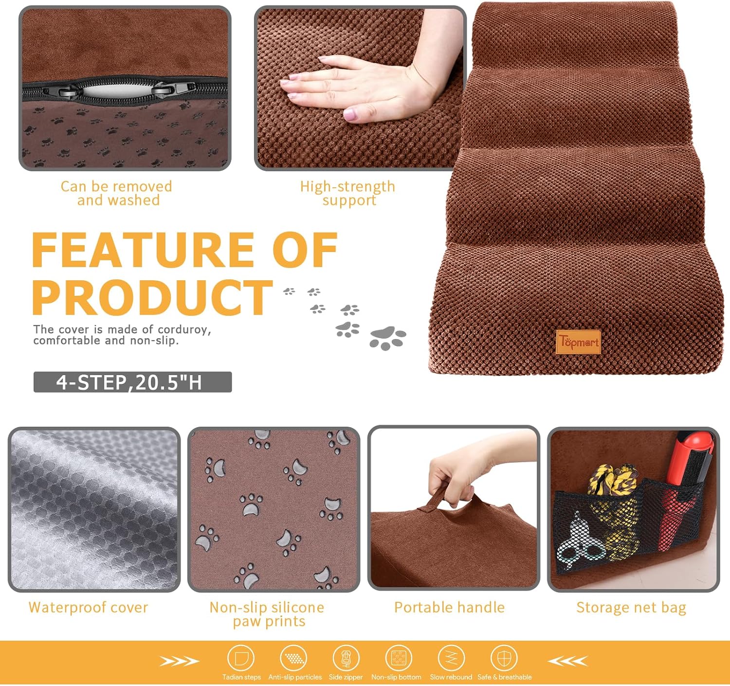 • Safer,Wider&Deeper Steps:Each step is 15.75in x 7.1in.Our dog stairs are excellent for those older dogs who are less mobile as they age or for cats with injuries. More wide and deep steps are helpful for reducing the strain that constantly jumping up and down onto bed,sofa or car can have on your pet's joints,and Topmart dog steps will not shake and slip during use. The cover made of corduroy is more frictional than other covers, pets will not slip on the stairs.