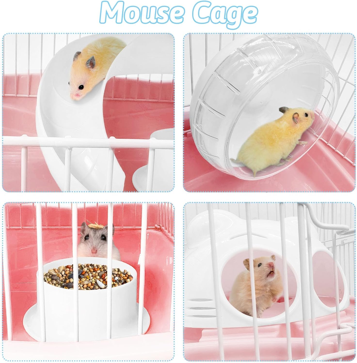 • Hamster cage: Set includes mice cage*1, castle house*1, 2nd floor platform*1, slide*1, running wheel*1, water bottle*1, food bowl*1. The hamster cage has a sturdy structure, which allows you to ventilate the cage and see your pet's activities
